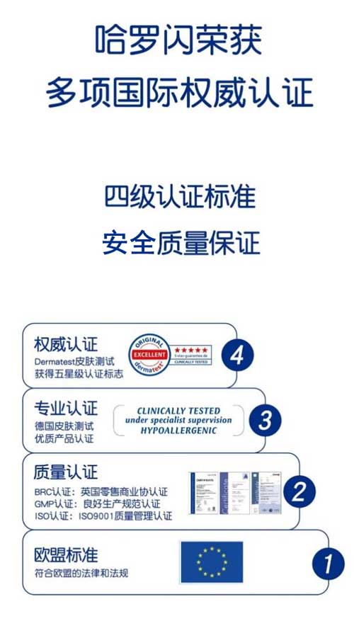 哈羅閃的產(chǎn)品研發(fā)、生產(chǎn)均符合歐盟標(biāo)準,并擁有德國皮膚測試的優(yōu)質(zhì)產(chǎn)品認證;如,哈羅閃嬰兒凈護二合一洗發(fā)沐浴露、哈羅閃嬰兒柔護潤膚乳、哈羅閃嬰兒柔護按摩油、哈羅閃嬰兒溫和護膚霜等,均通過了德國權(quán)威皮膚科醫(yī)生協(xié)會認證Dermatest的皮膚測試,并獲得5星級認證,達到5星標(biāo)準即代表產(chǎn)品通過極為嚴苛的檢測程序。