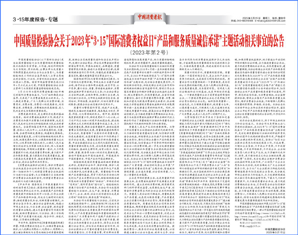 中國經(jīng)濟(jì)網(wǎng)北京3月15日訊(記者 佟明彪 蘇蘭) 春來潮涌,奮楫揚(yáng)帆。在2023年“3·15”國際消費(fèi)者權(quán)益日到來之際,中國質(zhì)量檢驗(yàn)協(xié)會(huì)(以下簡稱質(zhì)檢協(xié)會(huì))組織開展2023年“3·15”“產(chǎn)品和服務(wù)質(zhì)量誠信承諾”主題活動(dòng),包括中國航天科技、格力、美的、紅九九、名臣健康、安莉芳等各行各業(yè)2000多家優(yōu)秀企業(yè)積極響應(yīng)參與,在推動(dòng)經(jīng)營者質(zhì)量誠信自律、維護(hù)消費(fèi)者合法權(quán)益、持續(xù)優(yōu)化營商環(huán)境等方面展現(xiàn)了質(zhì)量領(lǐng)域社團(tuán)組織在新時(shí)代的新作用。