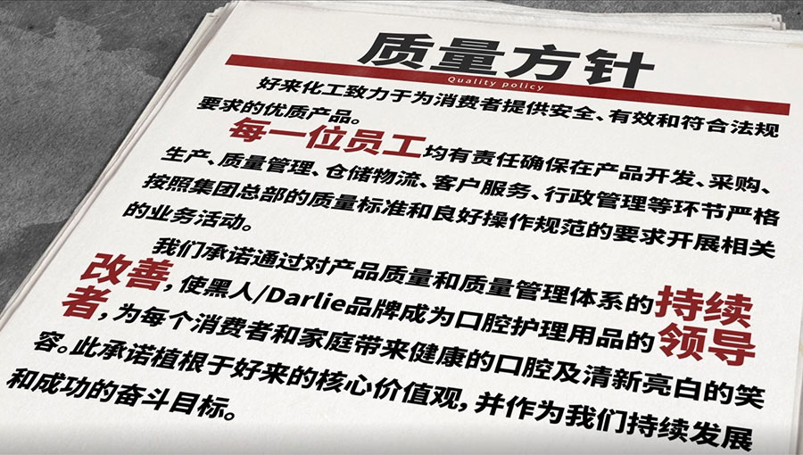 好來化工通過對產(chǎn)品質量和質量管理體系的持續(xù)改善,使“DARLIE”黑人品牌成為口腔護理用品的領導者,為每個消費者和家庭帶來健康的口腔及清新亮白的笑容。此承諾植根于好來的核心價值觀,并作為好來持續(xù)發(fā)展和成功的奮斗目標。
