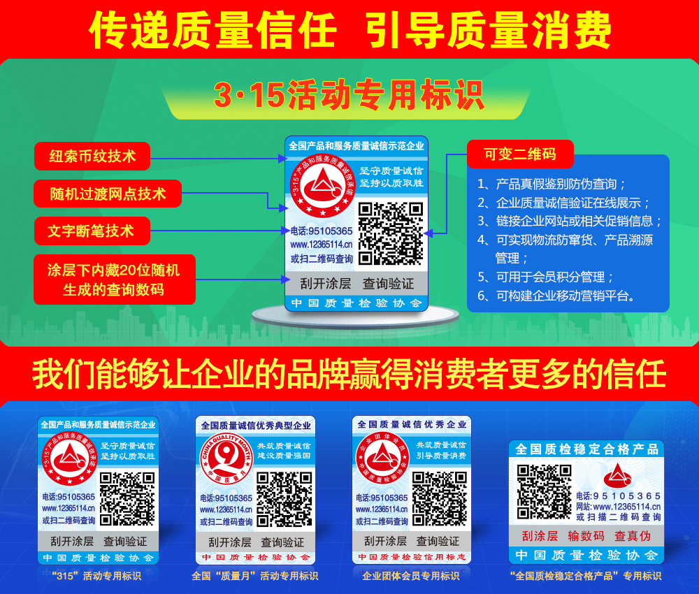 中國質(zhì)量檢驗協(xié)會防偽溯源和物流管理服務(wù)系統(tǒng)(簡稱中檢聯(lián)合質(zhì)量誠信驗證系統(tǒng))是以物聯(lián)網(wǎng)、大數(shù)據(jù)、云計算、區(qū)塊鏈和移動互聯(lián)網(wǎng)技術(shù)為基礎(chǔ)建設(shè)的全過程防偽溯源與質(zhì)量誠信驗證服務(wù)平臺,依托廣大技術(shù)機(jī)構(gòu)的技術(shù)支撐,應(yīng)用二維碼為載體,使用一物一碼防偽技術(shù),同時采用文字、圖片和視頻等多媒體方式,完整記錄產(chǎn)品的原料來源、生產(chǎn)加工、倉儲物流和市場銷售等詳細(xì)信息,融合實現(xiàn)產(chǎn)品質(zhì)量來源可查、去向可追、責(zé)任可究的全過程追溯,切實方便企業(yè)履行質(zhì)量安全主體責(zé)任并用科技、智能化、信息化的手段去加強(qiáng)質(zhì)量安全風(fēng)險控制,維護(hù)消費者合法權(quán)益,讓人民群眾買得放心、吃得放心、用得放心...
