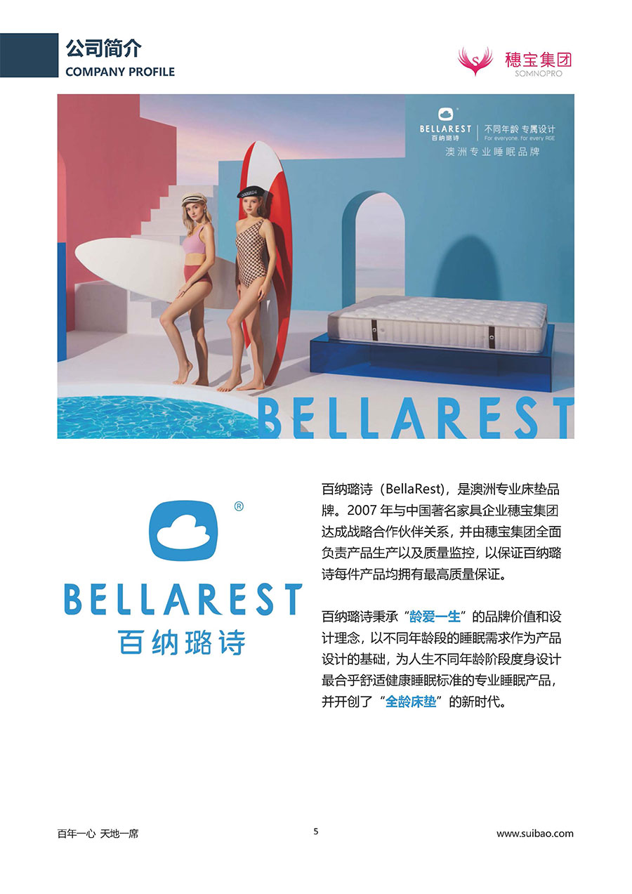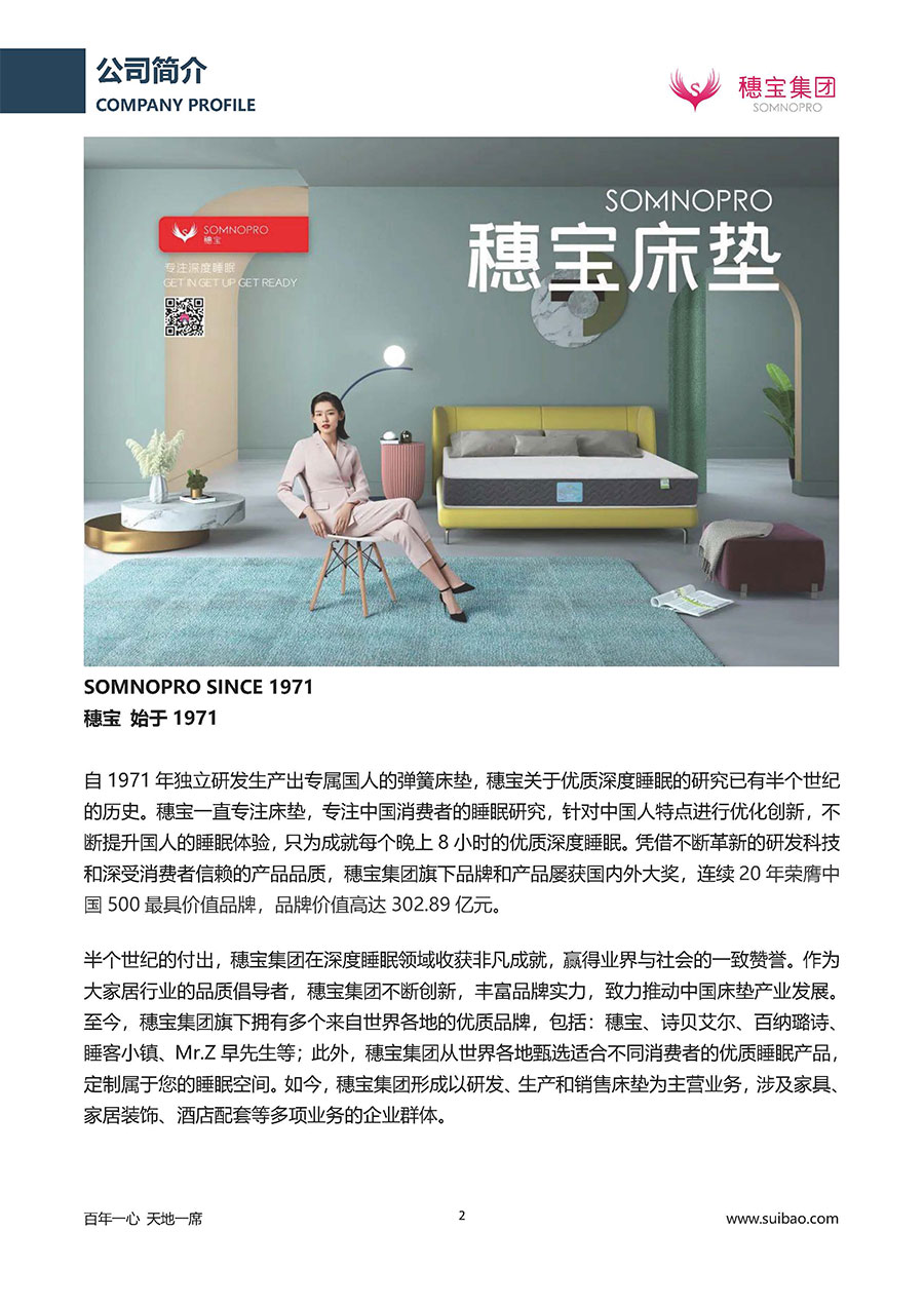 半個世紀的付出,穗寶集團在深度睡眠領域收獲非凡成就,贏得業(yè)界與社會的一致贊譽。作為大家居行業(yè)的品質倡導者,穗寶集團不斷創(chuàng)新,豐富品牌實力,致力推動中國床墊產(chǎn)業(yè)發(fā)展。至今,穗寶集團旗下?lián)碛卸鄠€來自世界各地的優(yōu)質品牌,包括:穗寶、詩貝艾爾、百納璐詩、睡客小鎮(zhèn)、Mr.Z早先生等;此外,穗寶集團從世界各地甄選適合不同消費者的優(yōu)質睡眠產(chǎn)品,定制屬于您的睡眠空間。如今,穗寶集團形成以研發(fā)、生產(chǎn)和銷售床墊為主營業(yè)務,涉及家具、家居裝飾、酒店配套等多項業(yè)務的企業(yè)群體。