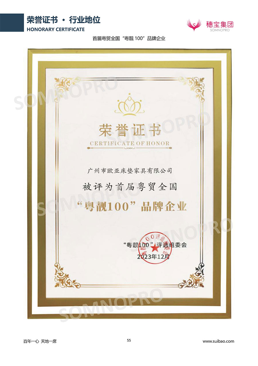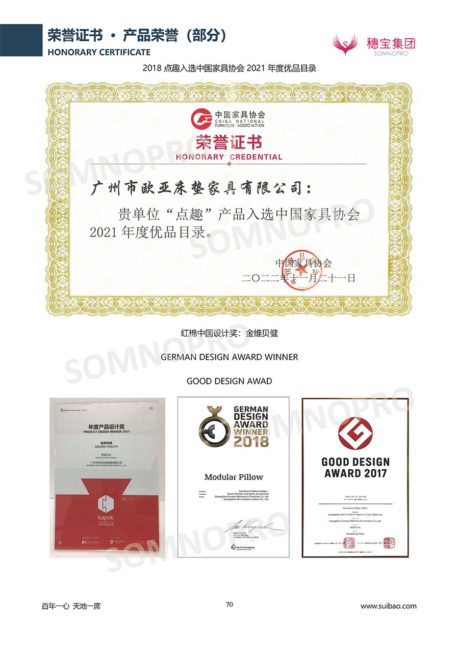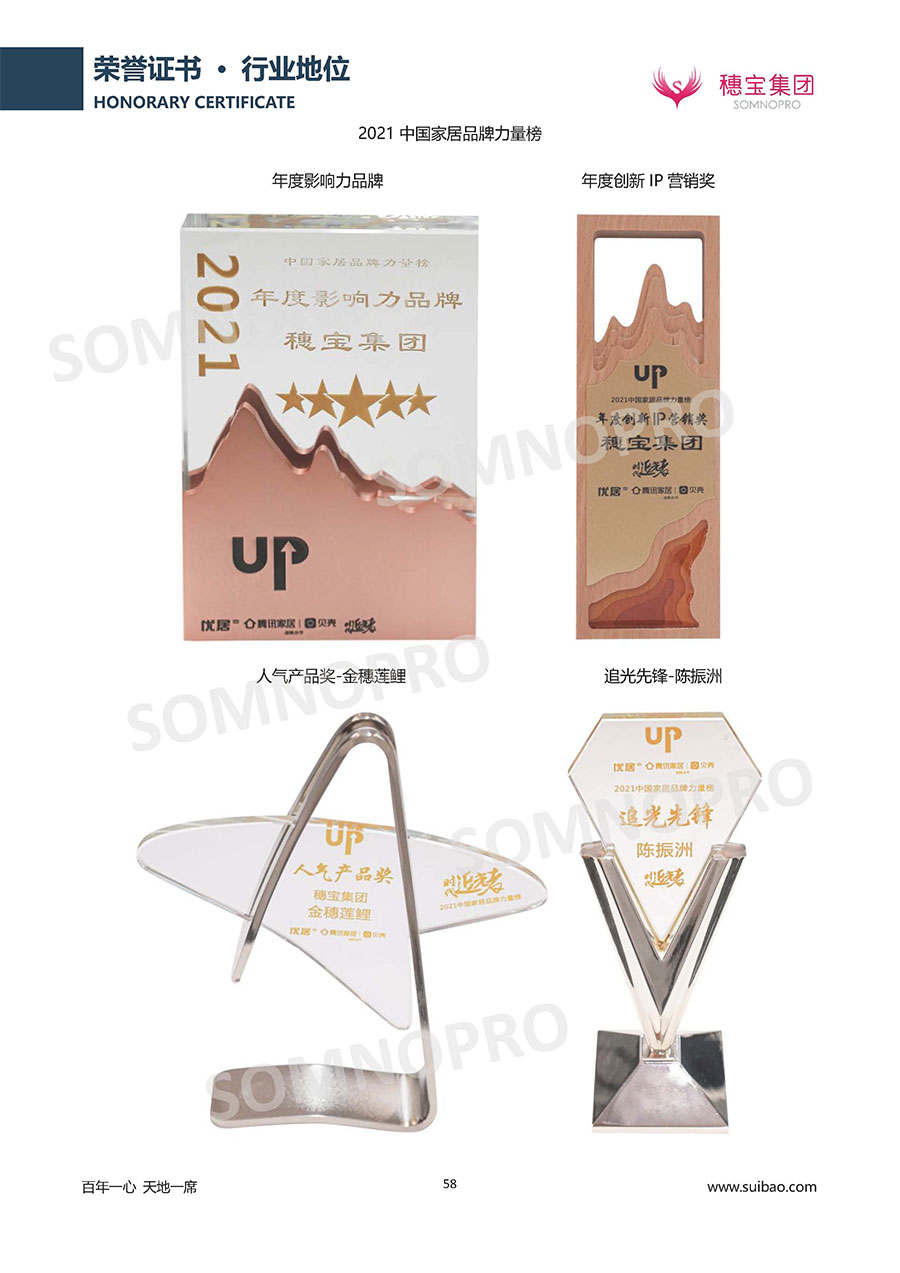 自1971年獨立研發(fā)生產(chǎn)出專屬國人的彈簧床墊,穗寶關于優(yōu)質深度睡眠的研究已有半個世紀的歷史。穗寶一直專注床墊,專注中國消費者的睡眠研究,針對中國人特點進行優(yōu)化創(chuàng)新,不斷提升國人的睡眠體驗,只為成就每個晚上8小時的優(yōu)質深度睡眠。憑借不斷革新的研發(fā)科技和深受消費者信賴的產(chǎn)品品質,穗寶集團旗下品牌和產(chǎn)品屢獲國內(nèi)外大獎,連續(xù)20年榮膺中國500最具價值品牌,品牌價值高達302.89億元。