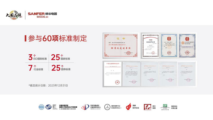 帥豐電器堅持以品質為導向,擁有行業(yè)首個“中國合格評定國家認可委員會認可實驗室”,包含燃氣、電氣、噪聲、氣味降低度、油脂分離度、環(huán)境、包裝等多個行業(yè)一流的試驗室,可開展上百項集成灶指標檢測,為產品品質和新品研發(fā)提供了有力保障。代表行業(yè)參與60個標準制定,包括3個ISO國際標準、25個國家標準、7個行業(yè)標準、25個團體標準,為推動行業(yè)發(fā)展做出了重要貢獻。