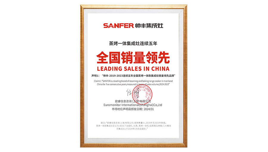 帥豐電器立足用戶需求進行集成灶產品的迭代升級,從消毒柜款、單獨烤箱款、蒸箱款集成灶,到蒸烤一體款,再到蒸烤同步款,不論是在產品功能還是技術性能上,帥豐電器都處于行業(yè)領先水平,根據(jù)歐睿國際調研數(shù)據(jù)顯示,帥豐蒸烤一體集成灶2019年-2023年連續(xù)5年全國銷量領先。