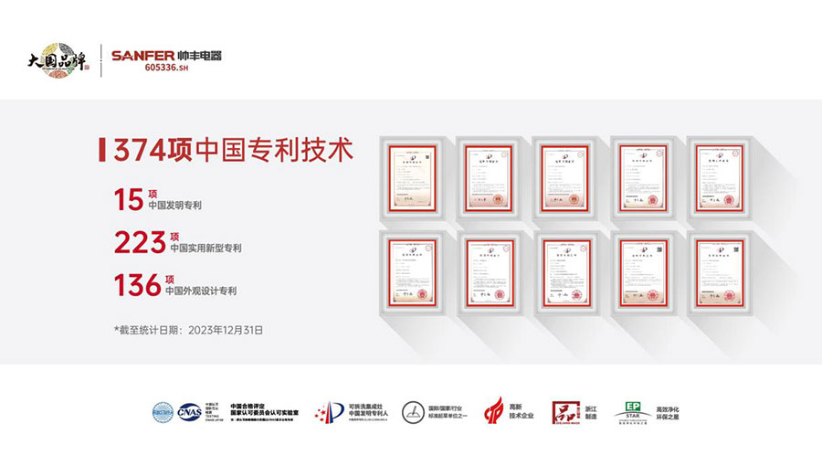 自2005年組建團隊研發(fā)集成灶產品開始,帥豐電器在集成灶領域不斷深耕,截至目前,帥豐電器及其子公司合計擁有專利374項,其中發(fā)明專利15項,實用新型專利223項,外觀設計專利136項,在集成灶煙機風道系統(tǒng)、燃燒器系統(tǒng)、蒸烤箱系統(tǒng)等核心系統(tǒng)的技術性能上,擁有自主知識產權,且多項系統(tǒng)的性能指標領先于行業(yè),直流變頻斑彩螺風道系統(tǒng)擁有13項專利認證,增強風壓效果,優(yōu)化油煙系統(tǒng),油煙吸凈率99.96%行業(yè)領先;同時,擁有10項改善和降低噪聲的專利認證,消除了置于人體頭部的噪聲源,工作噪聲遠低于國家規(guī)定的上限值且優(yōu)于行業(yè)平均水平;還有帥豐與浙工大聯(lián)合研發(fā)的koms廚房全局監(jiān)控系統(tǒng)——帥豐第十項發(fā)明專利,擁有智慧烹飪、健康提醒、安全防護3大科技功能。