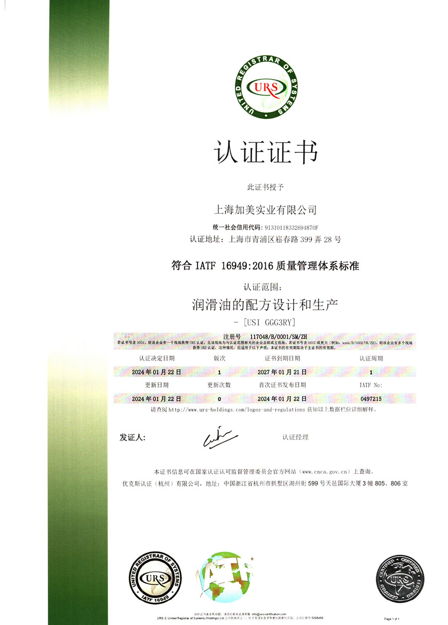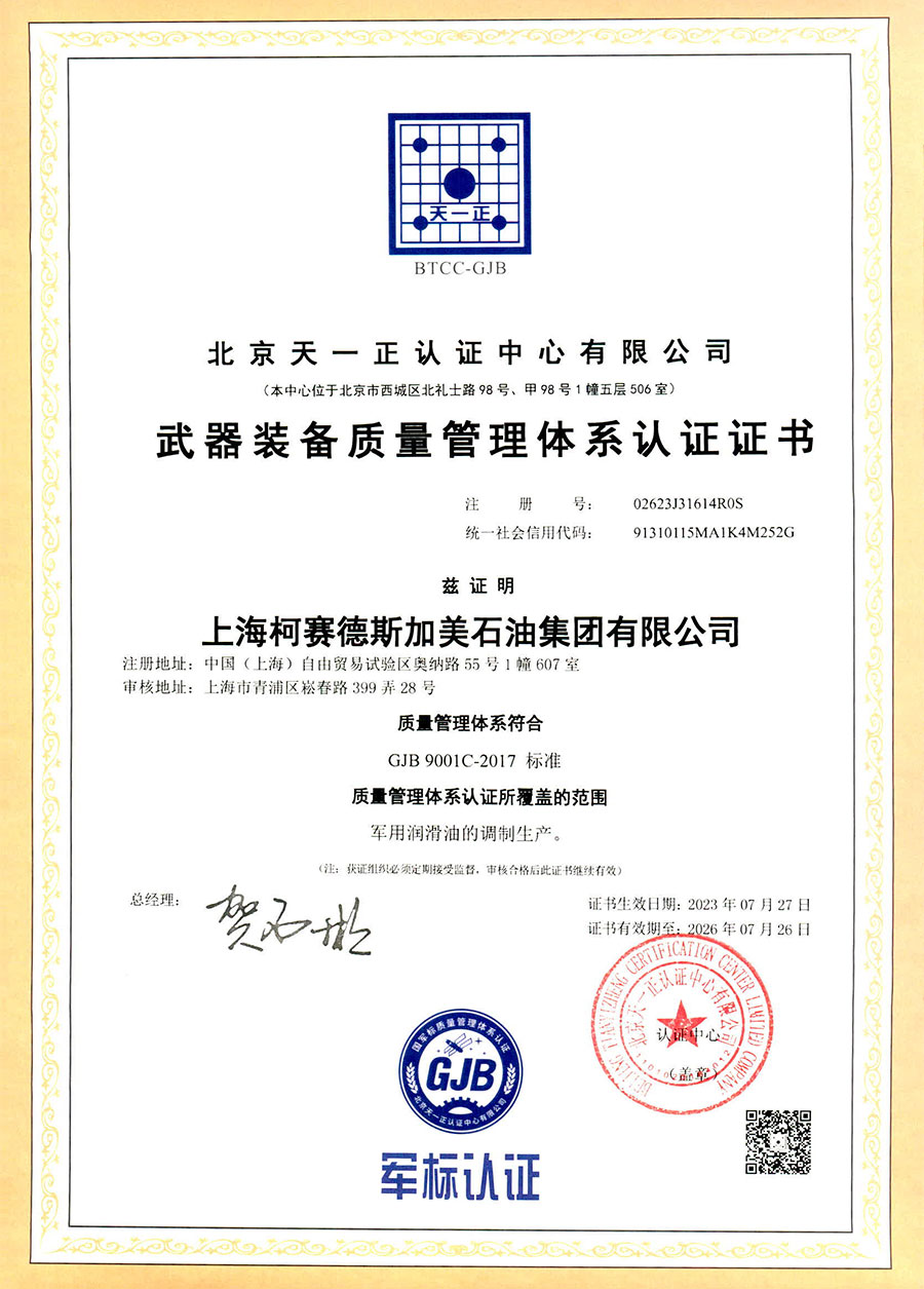 柯賽德斯集團公司統(tǒng)一遵循嚴格的質(zhì)量保證體系,先后通過了武器裝備質(zhì)量管理體系認證GJB9001C-2017、ISO/TS16949、IS09001質(zhì)量體系認證、1S014001環(huán)境體系認證及ISO45001:2018職業(yè)健康安全管理體系認證。隨著業(yè)務領(lǐng)域的不斷擴展,目前柯賽德斯集團公司先后與多家世界能源、化工方面的巨頭建立了產(chǎn)品服務、供應保障、技術(shù)合作、技術(shù)特別支持單位等方面的戰(zhàn)略合作關(guān)系。今天,柯賽德斯集團公司旗下管理著三大潤滑油品牌,實現(xiàn)了經(jīng)營上的多元化戰(zhàn)略格局。