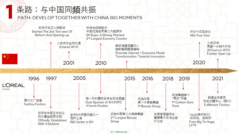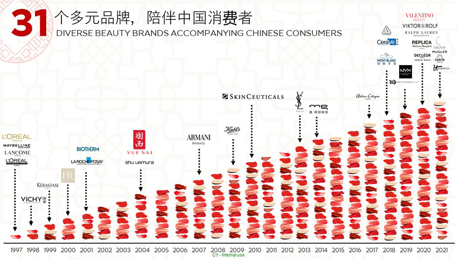 歐萊雅在1997年進(jìn)入中國(guó)。歐萊雅中國(guó)的總部位于上海,并在全國(guó)設(shè)有五個(gè)辦事處,目前在中國(guó)擁有31個(gè)品牌,一個(gè)研發(fā)和創(chuàng)新中心,兩家工廠(chǎng)分別位于蘇州和宜昌,共有超過(guò)14,000名員工。經(jīng)過(guò)25年高質(zhì)量、穩(wěn)健、可持續(xù)的增長(zhǎng),中國(guó)已成為歐萊雅集團(tuán)全球第二大市場(chǎng),該集團(tuán)北亞區(qū)美妝黃金三角洲的總部,以及該集團(tuán)美妝科技三大樞紐之一。作為中國(guó)最佳企業(yè)公民之一,歐萊雅中國(guó)始終貫徹落實(shí)該集團(tuán)提出的“歐萊雅,為明天——可持續(xù)發(fā)展承諾2030”,是該集團(tuán)第1個(gè)完整運(yùn)營(yíng)設(shè)施“零碳”的市場(chǎng),并積極通過(guò)社會(huì)責(zé)任項(xiàng)目,持續(xù)貢獻(xiàn)中國(guó)社會(huì)的美好發(fā)展。