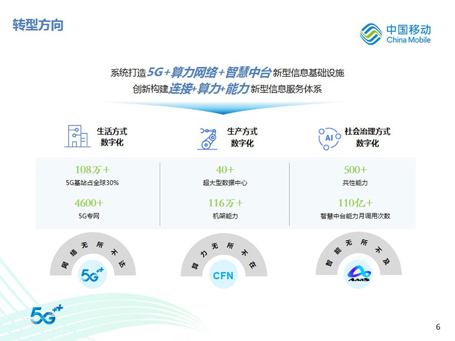 2022年,中國移動全年營運收入達到人民幣9,373億元,同比增長10.5%,其中通信服務(wù)收入達到人民幣8,121億元,同比增長8.1%。CHBN客戶規(guī)模、收入規(guī)模全面增長,HBN收入占通信服務(wù)收入比達到39.8%,同比提升4.1個百分點。得益于5G應(yīng)用、移動云、數(shù)字內(nèi)容、智慧家庭等業(yè)務(wù)的快速拓展,數(shù)字化轉(zhuǎn)型收入達到人民幣2,076億元,同比增長30.3%。整體來看,公司著力打造的數(shù)字化轉(zhuǎn)型收入增長“第二曲線”卓有成效,收入結(jié)構(gòu)更加均衡穩(wěn)健,可持續(xù)增長動能不斷增強,抗風(fēng)險能力顯著提升。