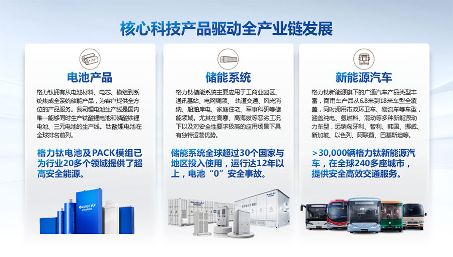 以完善的研發(fā)體系,公司加快技術(shù)創(chuàng)新與產(chǎn)業(yè)升級的步伐。公司研發(fā)的格力鈦電池安全性長期領(lǐng)跑行業(yè),憑借具有高安全、大倍率、快充放、耐寬溫、長壽命等特性,被選為“國家制造業(yè)單項(xiàng)冠軍產(chǎn)品”,廣泛應(yīng)用于新能源汽車以及工商業(yè)園區(qū)、通訊基站、電網(wǎng)調(diào)頻、軌道交通、風(fēng)光消納、船舶岸電、家庭住宅、軍事科研等儲能領(lǐng)域,具有廣闊的市場前景和應(yīng)用價值。目前,格力鈦儲能產(chǎn)品已在丹麥、瑞士、芬蘭等全球30多個國家和地區(qū)使用,新能源汽車產(chǎn)品在北京、杭州、武漢、成都、青島、哈爾濱、包頭、??诘热?40多座城市運(yùn)營,12年全球零電池事故安全運(yùn)行。