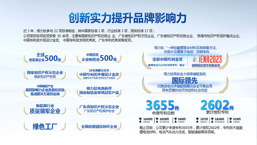 2022年,“一種鈦酸鋰復(fù)合材料及其制備方法、負(fù)極片及鋰離子電池”發(fā)明專利獲得中國專利金獎,摘得鋰電池行業(yè)內(nèi)的發(fā)明專利“首金”;2023年,該專利技術(shù)再次斬獲第75屆德國紐倫堡發(fā)明國際金獎。“高安全大倍率儲能系統(tǒng)關(guān)鍵技術(shù)研發(fā)與應(yīng)用”項(xiàng)目被中國機(jī)械工業(yè)聯(lián)合會鑒定達(dá)到“國際領(lǐng)先”水平。截止目前,公司先后獲得“中國民營企業(yè)制造業(yè)500強(qiáng)”、“全國質(zhì)量信得過產(chǎn)品”、“客車安全技術(shù)成果獎”、“中國儲能產(chǎn)業(yè)最具影響力企業(yè)獎、最佳系統(tǒng)集成商、最佳儲能電池供應(yīng)商”等榮譽(yù),獲得工信部頒發(fā)的“綠色工廠”榮譽(yù)稱號;上榜科技部發(fā)布的新能源領(lǐng)域獨(dú)角獸企業(yè),多年入選全球新能源企業(yè)500強(qiáng),入選“全國百佳質(zhì)量檢驗(yàn)誠信標(biāo)桿企業(yè)”、“國家知識產(chǎn)權(quán)優(yōu)勢企業(yè)”等。