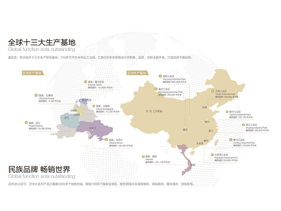 在全球設(shè)有多家子公司、分公司及關(guān)聯(lián)公司,運(yùn)營(yíng)網(wǎng)絡(luò)橫跨亞、美、歐、澳四大洲,擁有超過(guò)8000個(gè)銷售終端,產(chǎn)品暢銷中國(guó)、美國(guó)、英國(guó)、加拿大等100多個(gè)國(guó)家及地區(qū),旗下“CHEERS”、“芝華仕”和“頭等艙”品牌專賣店超過(guò)8000家,形成了體系完備的全球跨國(guó)發(fā)展大格局,已成為集研發(fā)、制造、銷售和服務(wù)于一體的國(guó)際化智能家居企業(yè)。
