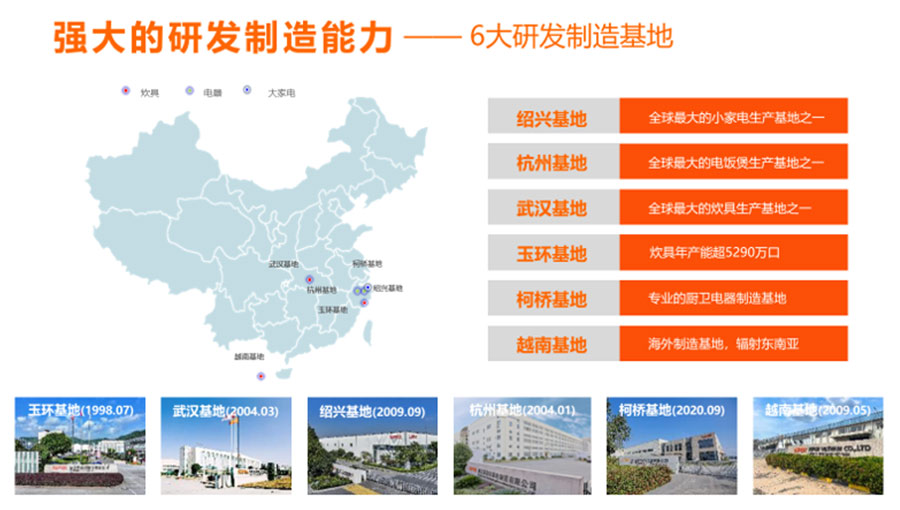 浙江蘇泊爾股份有限公司是中國(guó)最大、全球第二的炊具研發(fā)制造商之一,中國(guó)廚房小家電領(lǐng)先品牌。在杭州、玉環(huán)、紹興、武漢和越南建立了5大研發(fā)制造基地,擁有1萬(wàn)多名員工。蘇泊爾是中國(guó)炊具行業(yè)首家上市公司(股票代碼002032)。浙江蘇泊爾家電制造有限公司是浙江蘇泊爾股份有限公司的控股子公司,注冊(cè)資本13369萬(wàn)元,自2004年1月成立,主要生產(chǎn)電飯煲、電蒸鍋、電燉鍋、煎烤器等廚房小家電產(chǎn)品。2023年?duì)I收達(dá)到40.83億元,擁有2100多名員工,目前為中國(guó)最大的電飯煲生產(chǎn)基地之一。