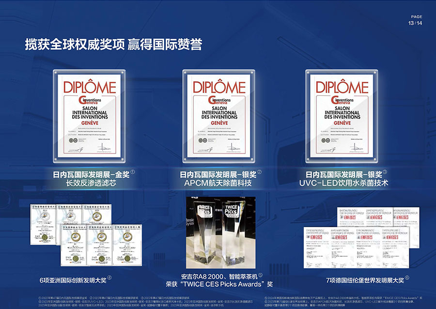38年間,安吉爾堅(jiān)持科技創(chuàng)新并主導(dǎo)行業(yè)技術(shù)升級,參與制定17項(xiàng)國家及行業(yè)標(biāo)準(zhǔn),獲得900余項(xiàng)技術(shù)專利,建成4大水質(zhì)實(shí)驗(yàn)室。2023年,該企業(yè)憑借創(chuàng)新實(shí)力包攬全球9項(xiàng)發(fā)明大獎(jiǎng),包括3項(xiàng)日內(nèi)瓦國際發(fā)明展獎(jiǎng)項(xiàng)與6項(xiàng)亞洲創(chuàng)新發(fā)明展獎(jiǎng)項(xiàng)。