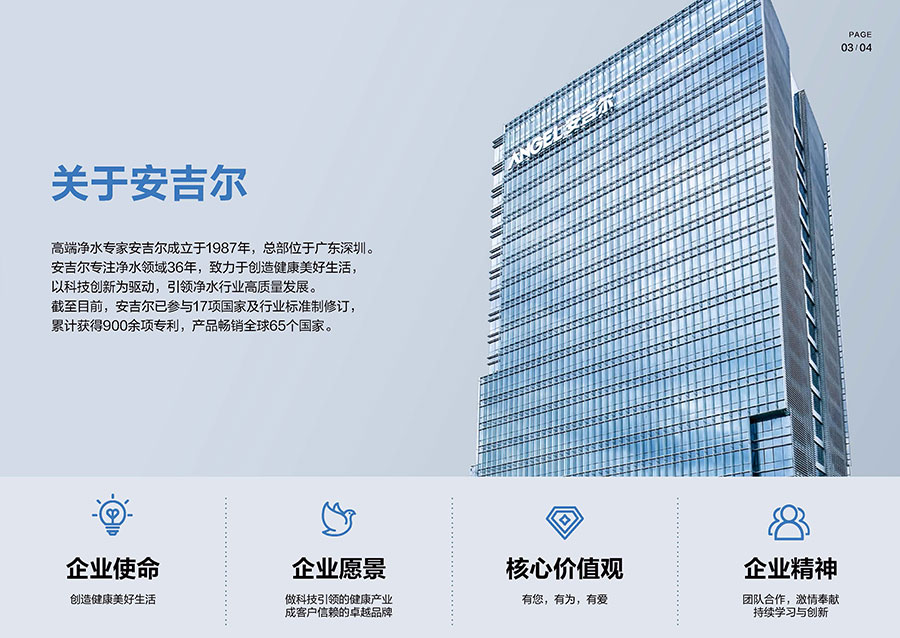 安吉爾成立于1987年,總部設(shè)立于廣東深圳。該品牌深耕凈水領(lǐng)域38年,其專業(yè)凈水器產(chǎn)品銷量持續(xù)領(lǐng)先。目前該企業(yè)已構(gòu)建超10000家渠道門店網(wǎng)絡(luò),其中包含近2000家專賣店,產(chǎn)品暢銷全球65個(gè)國家,累計(jì)服務(wù)超500萬活躍用戶。