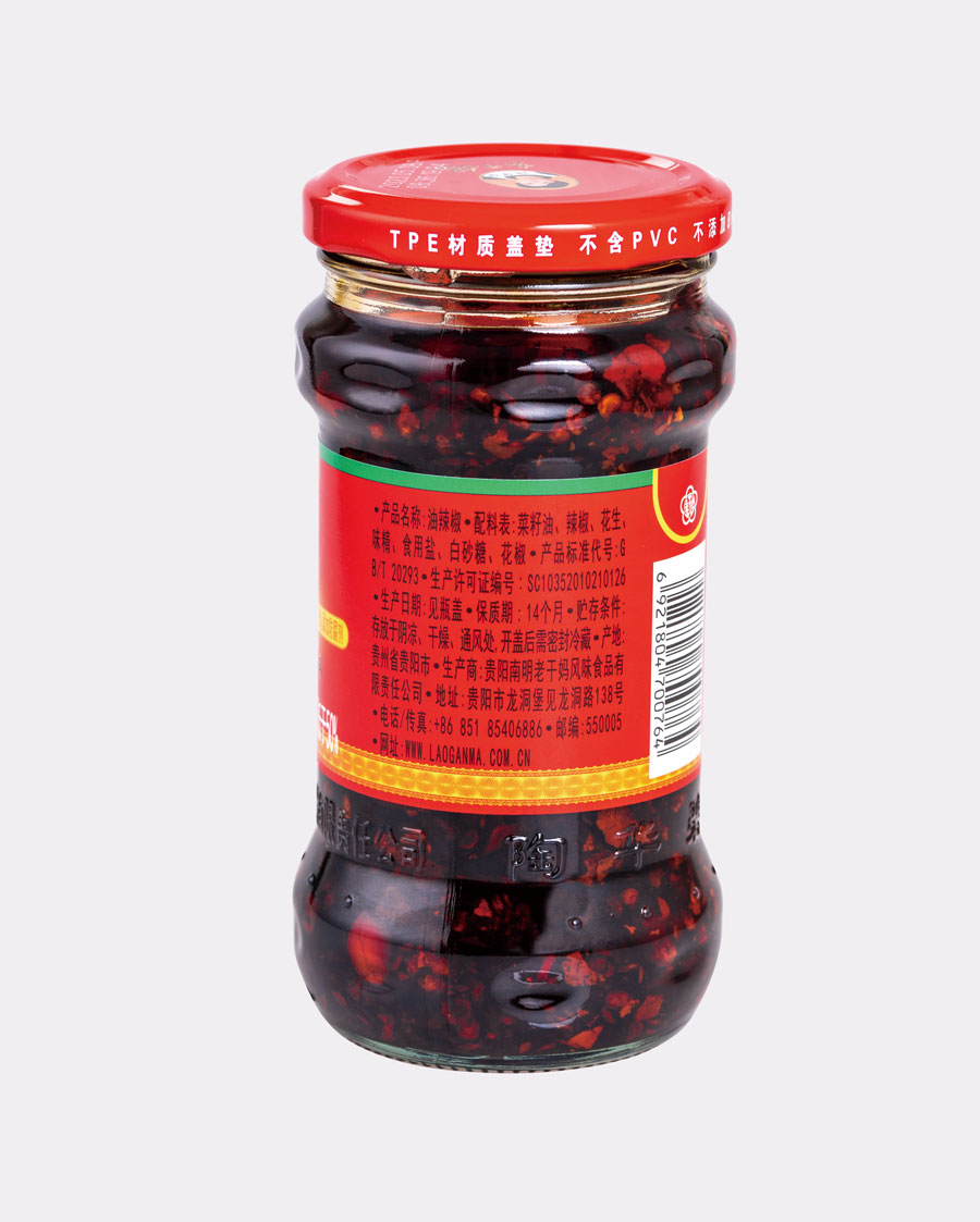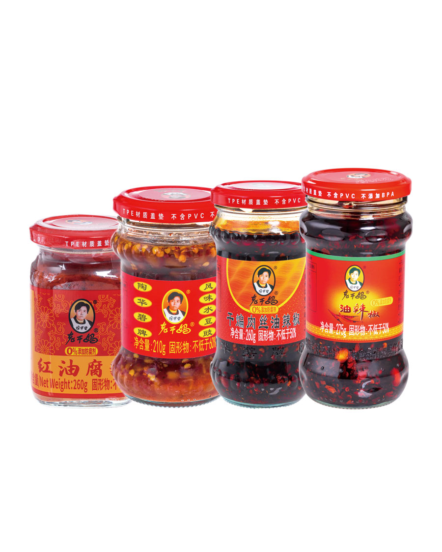 主要產(chǎn)品:老干媽牌油辣椒系列(油辣椒、風味豆豉、香菇、精制牛肉末豆豉、辣三丁、香辣脆、干煸肉絲、風味雞、肉絲豆豉)、油辣子大塊牛肉醬、火鍋底料(糟辣椒/植物油)、香辣醬、下飯菜、拌飯醬、風味水豆豉、紅油腐乳、風味腐乳、香辣菜、糟辣剁椒系列(姜蒜/中辣/微辣)、番茄辣醬