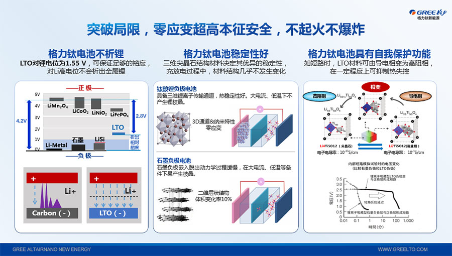 鈦酸鋰電池技術(shù)是新能源行業(yè)唯一獲得中國(guó)專利獎(jiǎng)金獎(jiǎng)的鋰電池產(chǎn)品技術(shù),其應(yīng)用于儲(chǔ)能電池和動(dòng)力電池具有超高安全性,在快充放、耐寬溫、長(zhǎng)壽命等方面同樣具有卓越的性能。格力鈦電池系列產(chǎn)品具有不起火不爆炸高安全、6分鐘快充放、-50℃至60℃耐寬溫特性,循環(huán)充放電次數(shù)高達(dá)30000多次,使用壽命長(zhǎng)達(dá)30年。格力鈦電池經(jīng)利鋸切割、尖針穿刺、強(qiáng)力擠壓、電鉆沖孔、短路充放電、高溫加熱、槍擊等極限條件測(cè)試,均未發(fā)生冒煙、起火、燃燒、爆炸等現(xiàn)象。