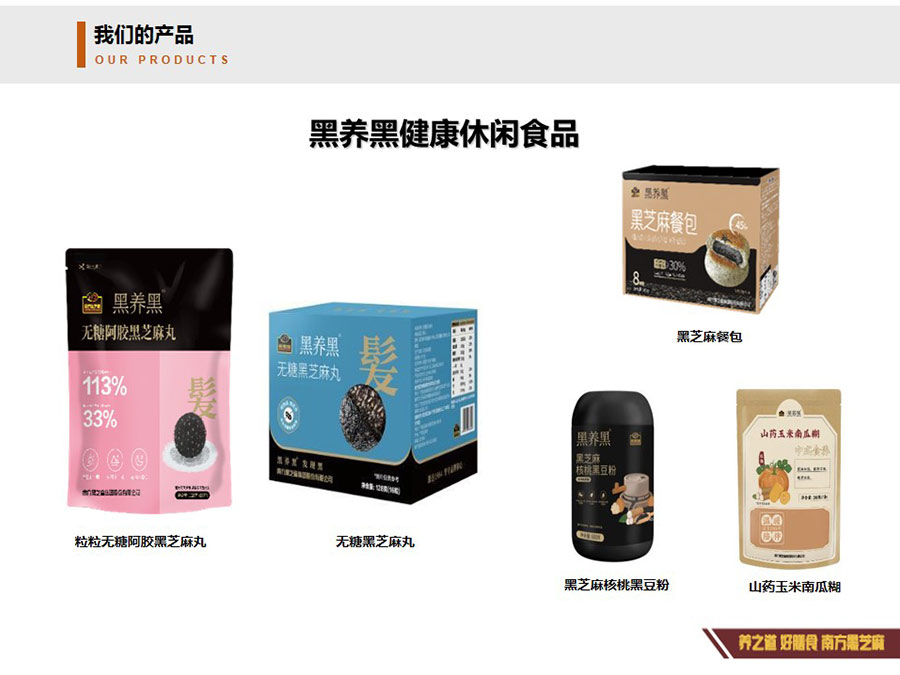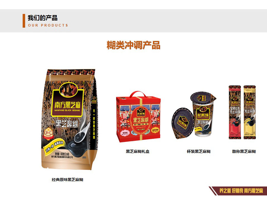 主要產(chǎn)品:黑芝麻糊、即食谷物餐粉、黑芝麻丸等產(chǎn)品
