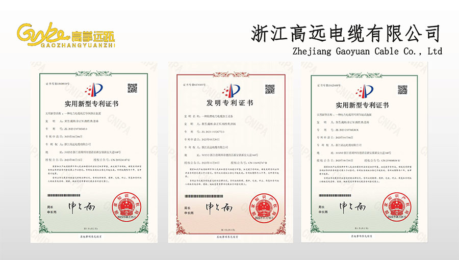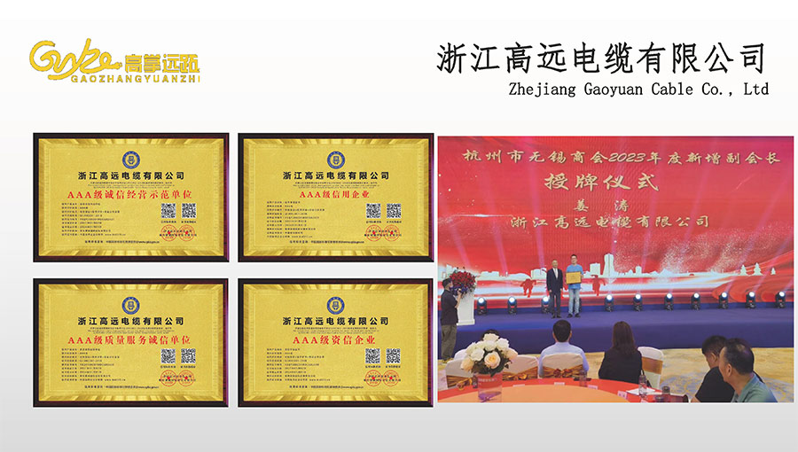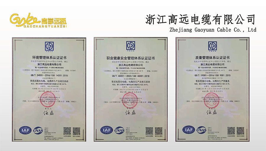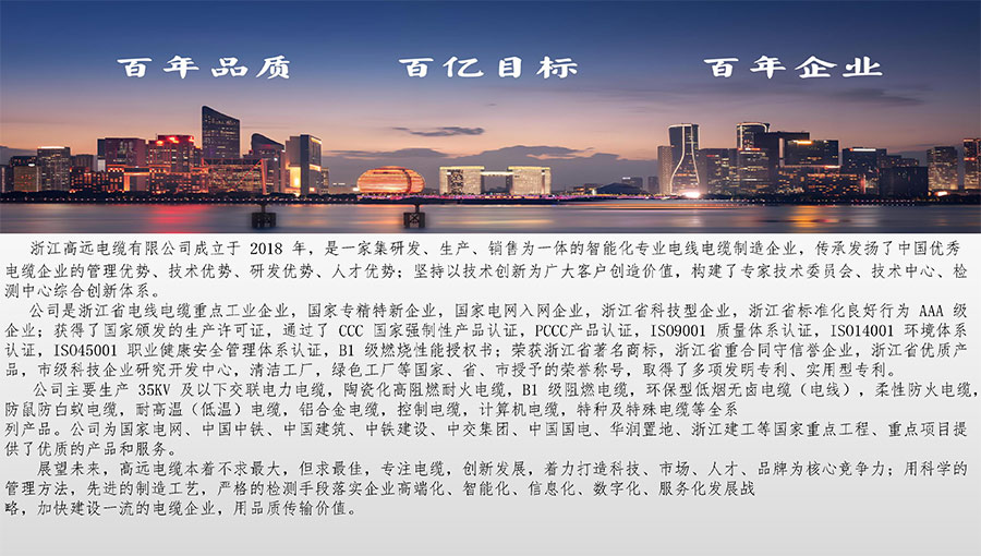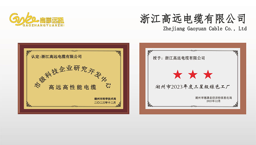 高遠(yuǎn)電纜是浙江省電線電纜重點(diǎn)工業(yè)企業(yè),浙江省專精特新企業(yè)、浙江省科技型企業(yè),浙江省標(biāo)準(zhǔn)化良好行為AAA級(jí)企業(yè);獲得了國(guó)家頒發(fā)的生產(chǎn)許可證,通過(guò)了CCC國(guó)家強(qiáng)制性產(chǎn)品認(rèn)證,ISO9001質(zhì)量體系認(rèn)證,ISO14001環(huán)境體系認(rèn)證,OHSAS18001職業(yè)健康安全管理體系認(rèn)證,PCCC產(chǎn)品認(rèn)證、B1級(jí)燃燒性能授權(quán)書(shū);榮獲浙江省著名商標(biāo),浙江省重合同守信譽(yù)企業(yè),浙江省優(yōu)質(zhì)產(chǎn)品,市級(jí)研究開(kāi)發(fā)中心,清潔工廠,綠色工廠等國(guó)家、省、市授權(quán)的榮譽(yù)稱號(hào),取得了多項(xiàng)發(fā)明專利、實(shí)用型專利。