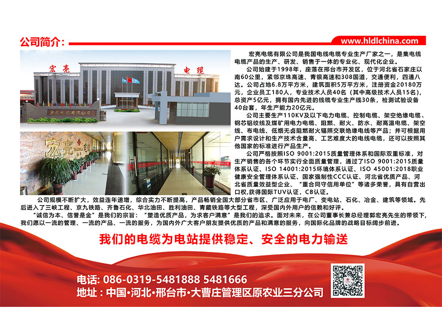 宏亮電纜有限公司是我國電線電纜專業(yè)生產(chǎn)廠家之一,是集電線電纜產(chǎn)品的生產(chǎn)、研發(fā)、銷售于一體的專業(yè)化、現(xiàn)代化企業(yè)。宏亮電纜始建于1988年,坐落在邢臺市開發(fā)區(qū),位于河北省石家莊以南60公里,緊鄰京珠高速、青銀高速和308國道,四通八達(dá)。