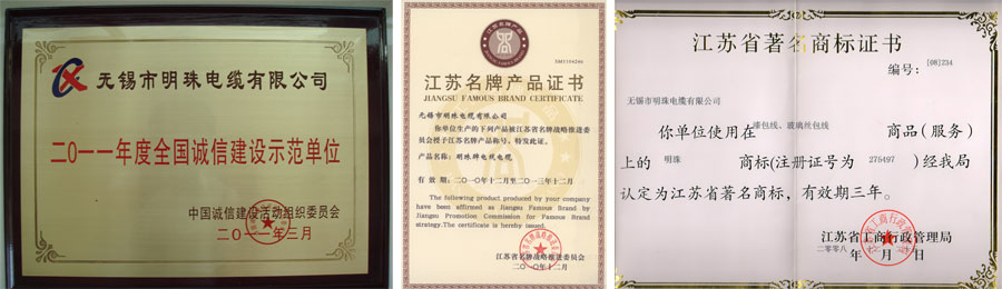 明珠電纜公司先后通過了ISO9001質(zhì)量管理體系認(rèn)證,ISO14001環(huán)境管理體系認(rèn)證,OHSAS18001職業(yè)健康安全管理體系認(rèn)證,國家強(qiáng)制性產(chǎn)品認(rèn)證(3C認(rèn)證),PCCC認(rèn)證,煤安MA認(rèn)證和全國工業(yè)產(chǎn)品生產(chǎn)許可證等認(rèn)證。“明珠”以優(yōu)質(zhì)品牌形象和優(yōu)秀的企業(yè)文化著稱于行業(yè)。“明珠牌”電線電纜產(chǎn)品先后被認(rèn)定為“全國用戶滿意產(chǎn)品”、“高新技術(shù)產(chǎn)品”、“江蘇省名牌產(chǎn)品”、“江蘇省用戶滿意產(chǎn)品”、“江蘇省市場(chǎng)抽檢合格產(chǎn)品”、“無錫市重點(diǎn)保護(hù)產(chǎn)品”等;“明珠”商標(biāo)被評(píng)為“江蘇省著名商標(biāo)”;明珠電纜公司先后榮獲“全國用戶滿意企業(yè)”、“全國重合同守信用企業(yè)”、“資信等級(jí)AAA企業(yè)”、“產(chǎn)品質(zhì)量信得過企業(yè)”等榮譽(yù)稱號(hào)。