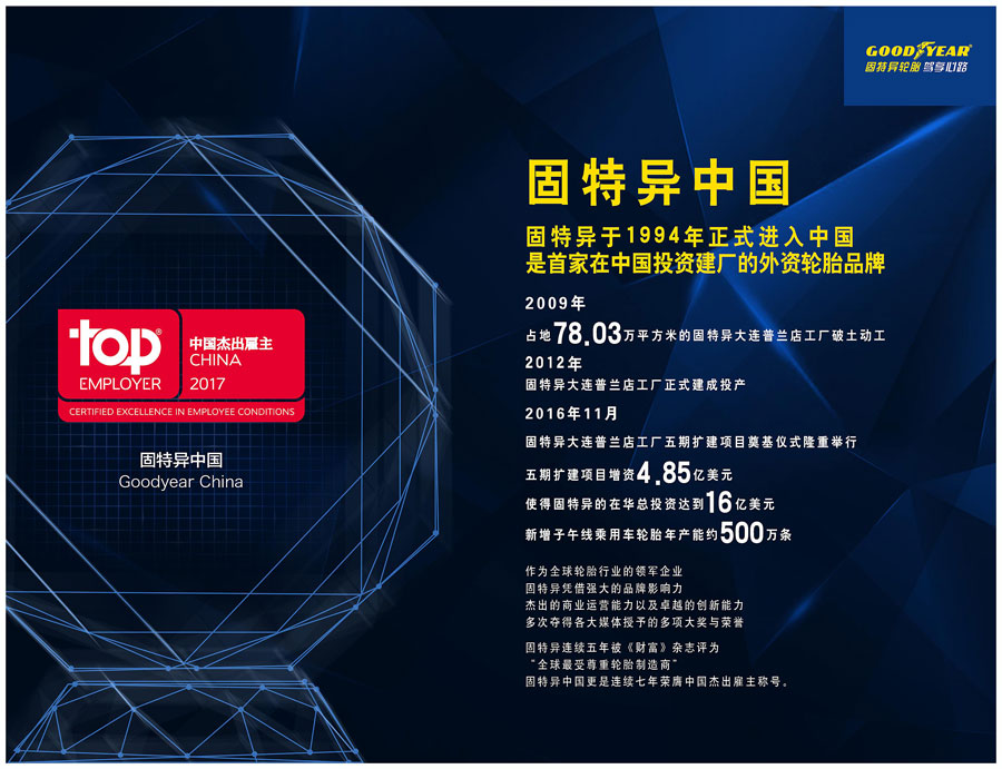 美國固特異輪胎于1994年9月率先進入中國市場,在大連創(chuàng)建了大連固特異輪胎有限公司,成為第一家來華投資建廠的西方輪胎企業(yè)。2008年11月,固特異大連通過股份收購成為固特異的獨資公司。截至目前,固特異在中國已擁有2600多名員工。