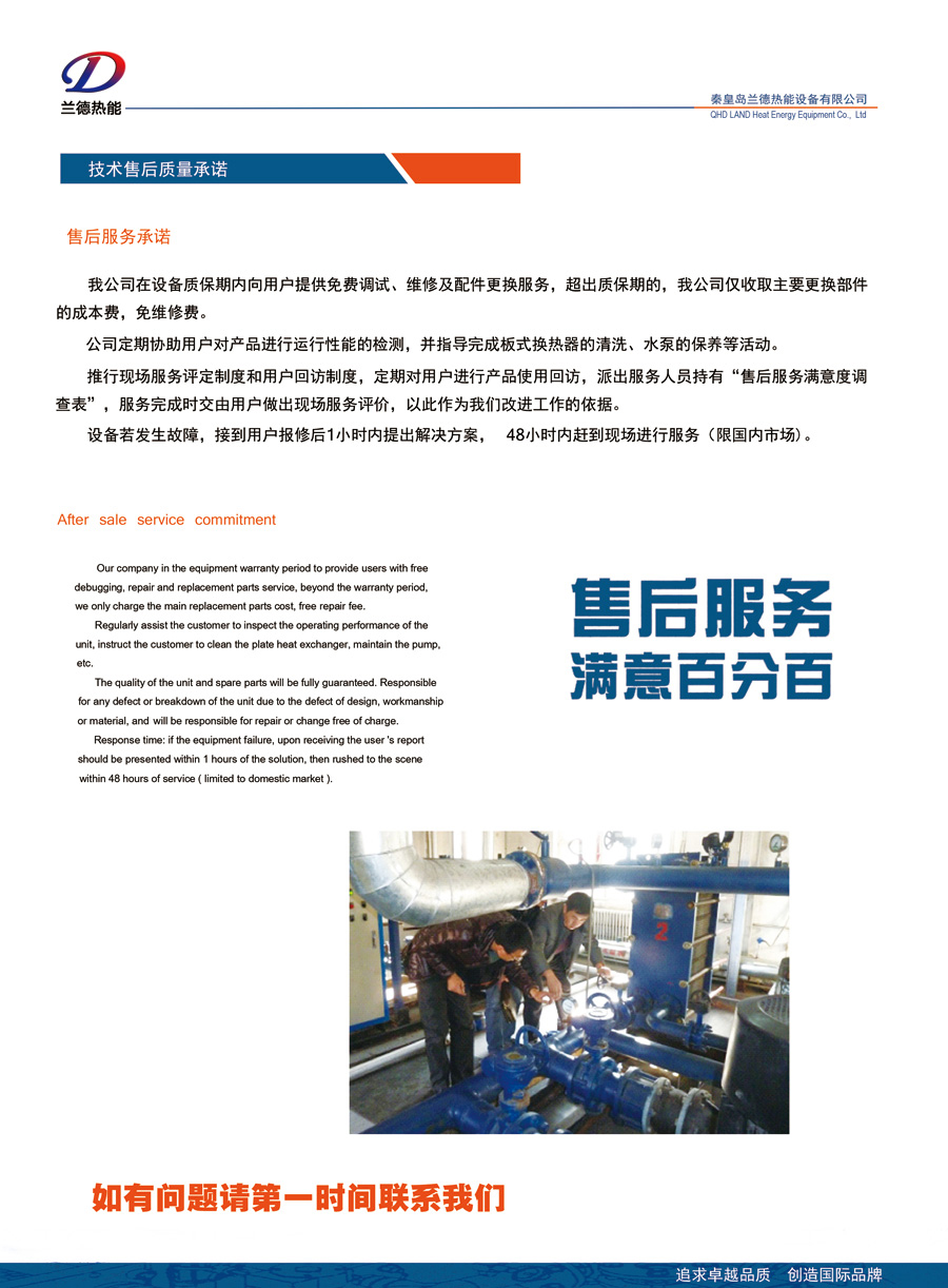 公司秉承“追求卓越品質(zhì),創(chuàng)造國際品牌”的經(jīng)營理念,隨時(shí)為客戶提供全球領(lǐng)先的換熱解決方案,專業(yè)提供高品質(zhì)的換熱設(shè)備和快速、高效的服務(wù),并贏得了行業(yè)領(lǐng)域多家客戶的信賴。許多國家重點(diǎn)工程項(xiàng)目及全國各大熱力公司都使用了我公司的產(chǎn)品,如大同熱力公司、包頭熱力公司、蘭州熱力公司、西山煤電熱力公司、釣魚臺(tái)國賓館、北京國資委、國家大劇院、大眾汽車、長慶油田等。蘭德熱能將竭誠為您提供優(yōu)質(zhì)的產(chǎn)品和最好的服務(wù)!