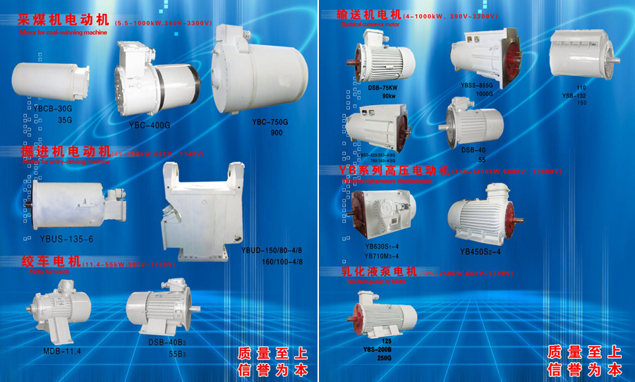 目前公司可生產(chǎn)4~1800KW,電壓等級380V、660V、1140V、3300V、6000V、10000V的礦用采煤機、運輸機、掘進機、乳化液泵、絞車、風機、YB電機等七大系列500多個品種,通過技術開發(fā),新研制了YBBP變頻一體機等高技術產(chǎn)品。