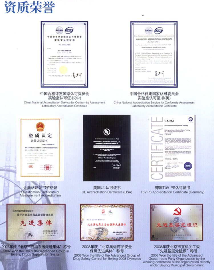 北京市醫(yī)療器械檢驗所(國家食品藥品監(jiān)督管理局北京醫(yī)療器械質量監(jiān)督檢驗中心,以下簡稱“北檢所”)是中國合格評定國家認可委員會(CNAS)、中國國家認證認可監(jiān)督管理委員會(CNCA)、國家食品藥品監(jiān)督管理局(SFDA)等部門認可授權的一所綜合性醫(yī)療器械產品檢測機構。經CNAS授權的檢驗范圍涵蓋醫(yī)用電子、醫(yī)用射線、核醫(yī)學、電聲學、體外診斷系統(tǒng)、一次性醫(yī)療產品、醫(yī)用防護用品、醫(yī)用橡膠制品、口腔材料、生物安全柜、電磁兼容、生物相容性等專業(yè)領域,檢驗項目涉及472項;經SFDA授權檢測項目達599項,承擔著授權范圍內醫(yī)療器械產品監(jiān)督抽驗檢驗、注冊檢驗、認證檢驗、進出口商品檢驗、科技成果鑒定檢驗以及委托檢驗、仲裁檢驗等檢測任務;2002年,成為中國質量認證中心(CQC)簽約實驗室,承擔醫(yī)用X射線診斷設備、心電圖機、血液透析裝置和橡膠避孕套的強制性產品安全認證檢測任務。此外,該所先后獲得TüV PS、UL等國際權威認證機構的認可,是目前國內開展檢驗業(yè)務專業(yè)最全面的醫(yī)療器械檢驗機構。