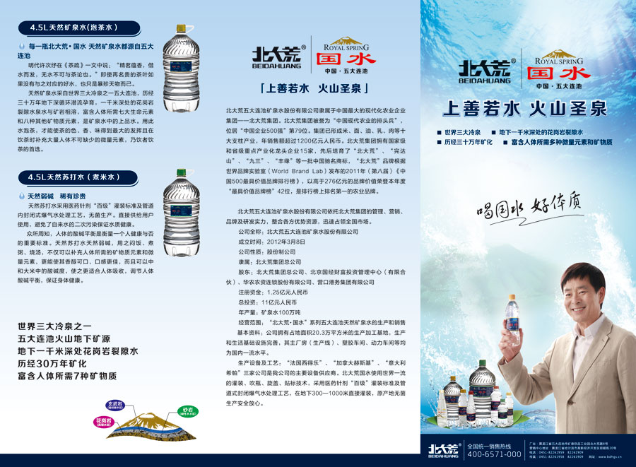北大荒五大連池礦泉水股份有限公司成立于2012年3月8日,隸屬于北大荒集團(tuán)總公司,其股東為:北大荒集團(tuán)總公司、北京國經(jīng)財富投資管理中心(有限合伙)、華農(nóng)農(nóng)資連鎖股份有限公司、營口港務(wù)集團(tuán)有限公司。其注冊資金1.25億元人民幣,總投資11億元人民幣。北大荒五大連池礦泉水股份有限公司擁有占地面積20.3萬平方米的生產(chǎn)加工基地,生產(chǎn)和生活基礎(chǔ)設(shè)施完善,由主廠房(生產(chǎn)線)、塑膠車間、動力車間、辦公樓、食堂宿舍及相關(guān)附屬設(shè)施組成。其經(jīng)營范圍為“北大荒•國水”系列五大連池天然礦泉水的生產(chǎn)和銷售,礦泉水年產(chǎn)量100萬噸。