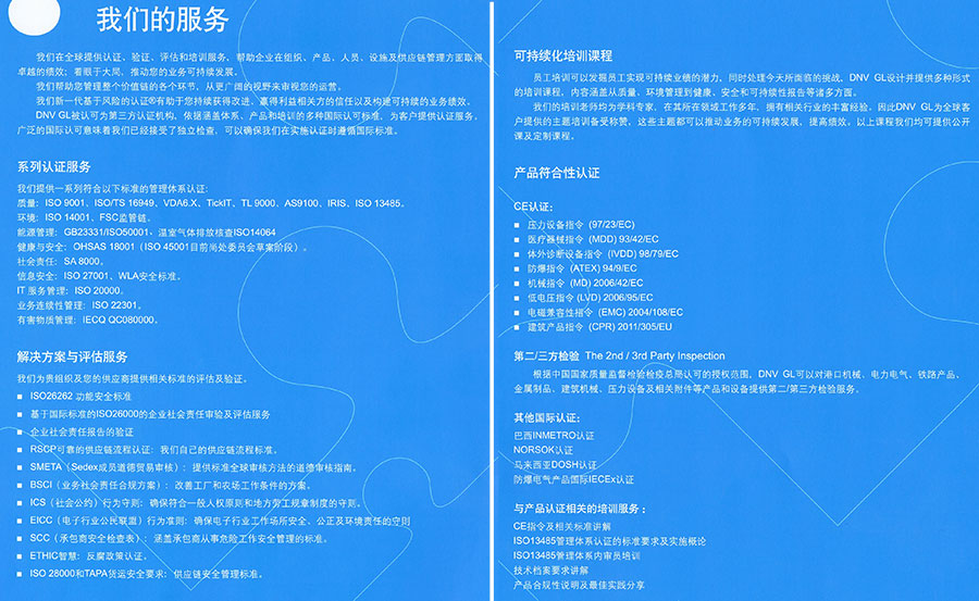 作為一家世界領(lǐng)先的提供管理服務(wù)的國(guó)際機(jī)構(gòu),DNV GL通過為客戶提供認(rèn)證、驗(yàn)證、評(píng)估和培訓(xùn)服務(wù),確??蛻粼诮M織、產(chǎn)品、人員、設(shè)施以及供應(yīng)鏈管理方面取得卓越的業(yè)績(jī)。我們始終與客戶通力合作,幫助客戶構(gòu)建一個(gè)業(yè)務(wù)可持續(xù)發(fā)展的平臺(tái),并贏得利益相關(guān)方的信任。