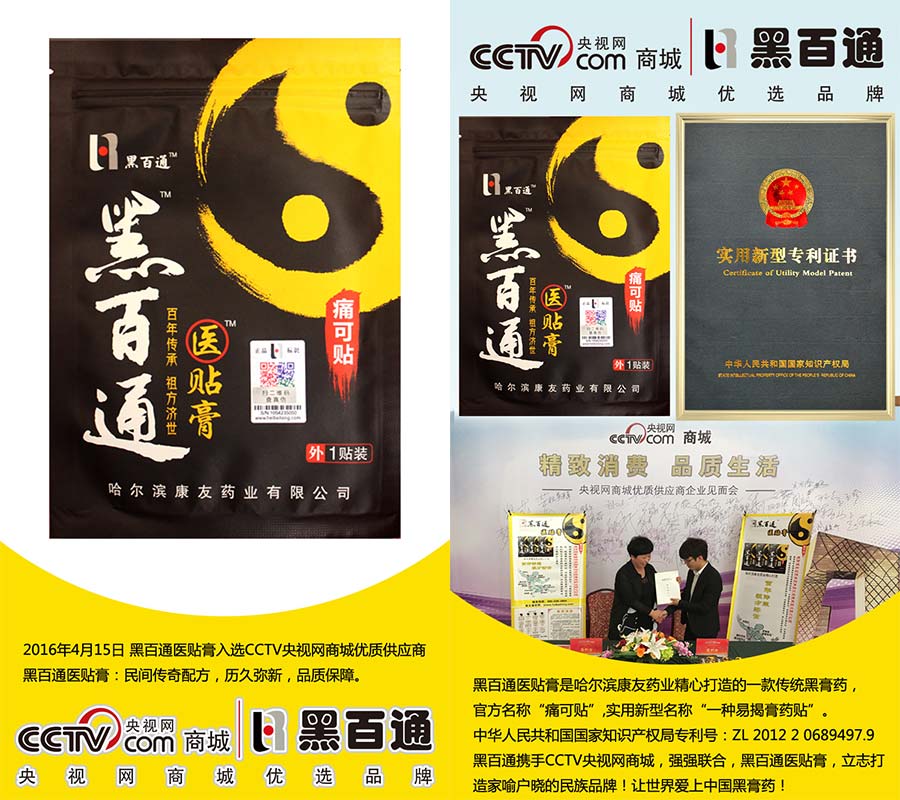 黑百通醫(yī)貼膏,每貼使用6-7天,持續(xù)使用168+小時(shí)。黑百通攜手CCTV央視網(wǎng)商城,強(qiáng)強(qiáng)聯(lián)合,立志打造家喻戶曉的民族品牌,讓世界愛(ài)上中國(guó)的黑膏藥!