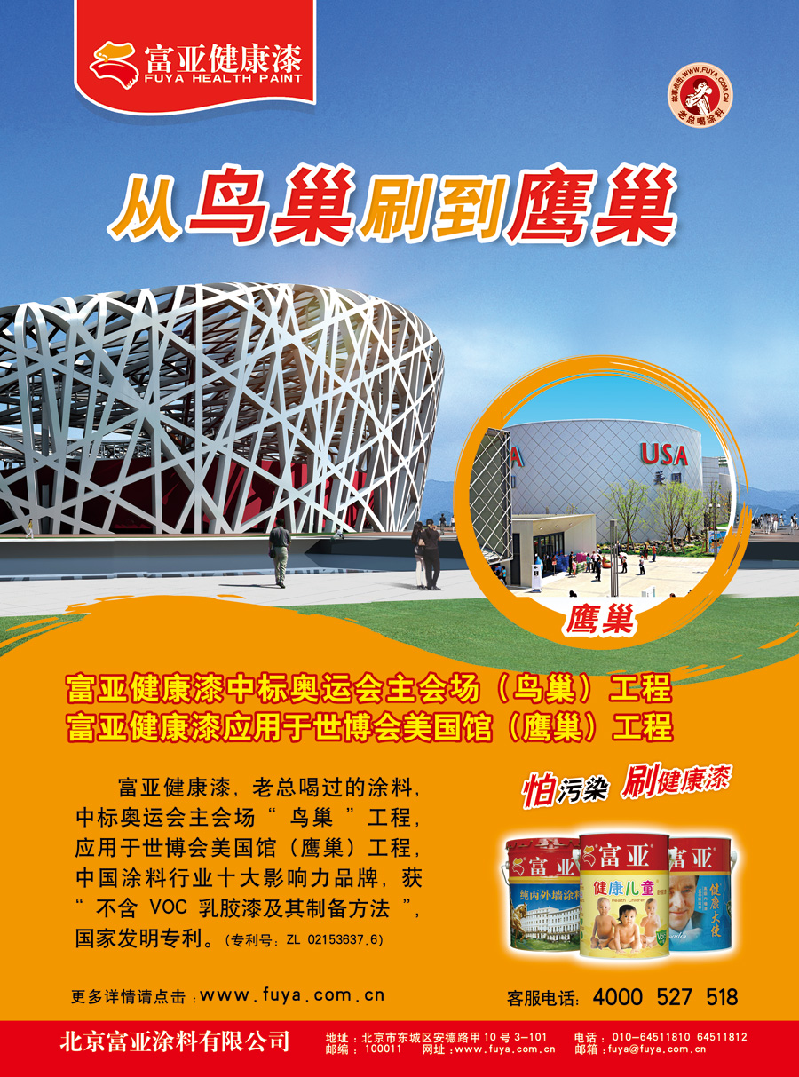 富亞涂料公司擁有多項(xiàng)國家專利,具有資深科研背景,與國內(nèi)各大科研院所、大學(xué)建有密切的合作關(guān)系,對于富亞企業(yè)的科技進(jìn)步,起到了強(qiáng)有力的支持作用。富亞涂料公司作為行業(yè)權(quán)威參與國家標(biāo)準(zhǔn)、行業(yè)標(biāo)準(zhǔn)的制定,為促進(jìn)行業(yè)發(fā)展貢獻(xiàn)了自己的力量。憑借企業(yè)強(qiáng)大的科研實(shí)力和雄厚的資金,富亞在環(huán)保與健康這個(gè)定位上,集中優(yōu)勢資源,一舉突破并實(shí)現(xiàn)VOC≈0的超級健康產(chǎn)品,實(shí)現(xiàn)了人類對健康乳膠漆的理想追求。2007年富亞產(chǎn)品一舉中標(biāo)奧運(yùn)會“鳥巢”裝飾工程;2011年富亞公司榮獲了北京市工商行政管理局頒發(fā)的2010年度“北京市著名商標(biāo)”榮譽(yù)證書;2012年,富亞健康漆入選商務(wù)部《對外援助成套項(xiàng)目主要設(shè)備材料產(chǎn)品目錄》。