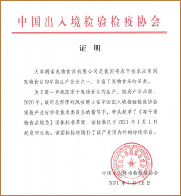 不僅在產(chǎn)品本身實(shí)現(xiàn)突破,2021年1月1日,在中國出入境檢驗(yàn)檢疫協(xié)會寵物產(chǎn)業(yè)標(biāo)準(zhǔn)化技術(shù)委員會指導(dǎo)下,由朗諾董事長劉鳳岐博士領(lǐng)銜起草的《凍干寵物食品規(guī)范》正式頒布并實(shí)施。身為十三年出口企業(yè),朗諾相信,通過不斷完善的行業(yè)標(biāo)準(zhǔn),越來越多真正優(yōu)秀的國內(nèi)品牌將更易獲得認(rèn)同,中國寵物食品行業(yè)也將勢如破竹、蒸蒸日上。期待不久將來中國民族企業(yè)將全線崛起,以嶄新的面貌立于全球市場的潮流之中。