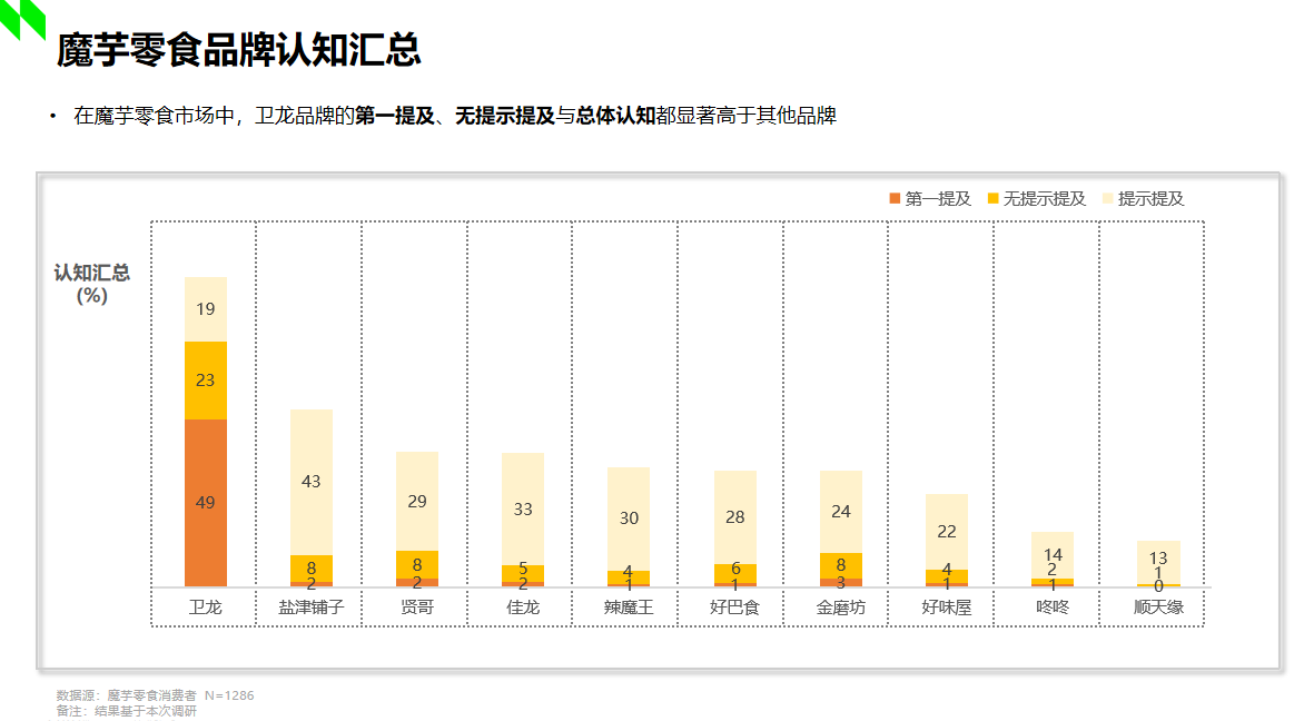 據(jù)2022年尼爾森調(diào)研顯示,在魔芋市場(chǎng)中,衛(wèi)龍品牌的第一提及、無(wú)提示提及與總體認(rèn)知都顯著高于其他品牌。顯然,衛(wèi)龍首創(chuàng)的魔芋爽在市場(chǎng)中已然奠定了良好且堅(jiān)固的受眾認(rèn)知基礎(chǔ),那么“小魔女”的加入,不僅進(jìn)一步充實(shí)了衛(wèi)龍自身的產(chǎn)品矩陣,占位了“魔芋素毛肚”的產(chǎn)品類(lèi)目,也將引領(lǐng)魔芋休閑食品賽道邁向更高品質(zhì)的發(fā)展方向,為市場(chǎng)創(chuàng)造全新的增量機(jī)遇。