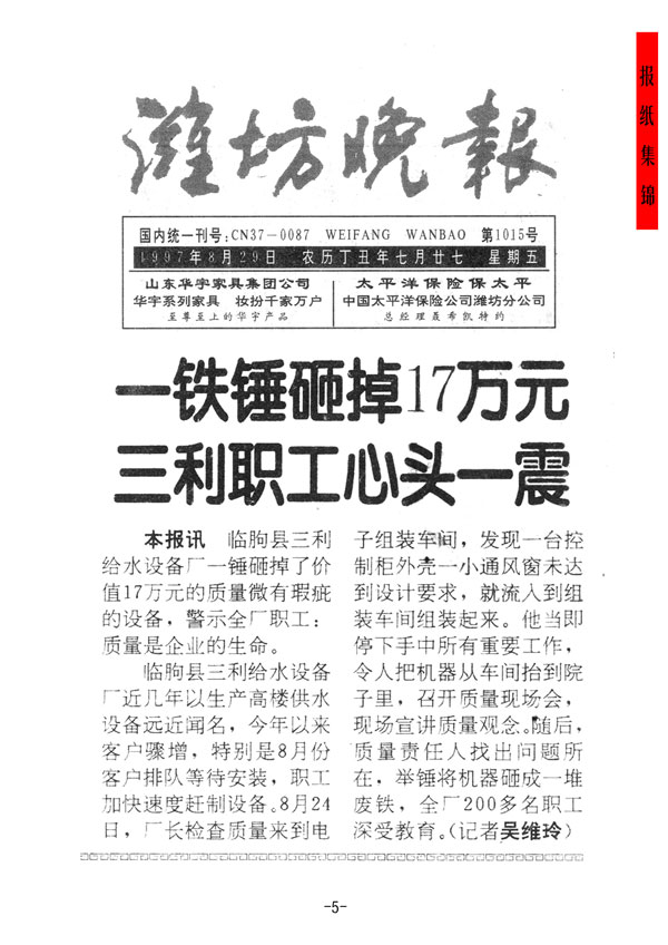 正是這驚心動魄的一錘砸出了三利人的質(zhì)量意識,砸出了三利人高精細(xì)嚴(yán)、精益求精的品質(zhì),砸出了企業(yè)對用戶的信譽(yù)和責(zé)任,砸出了“誰的責(zé)任誰承擔(dān)”的主人翁意識。從此,有了三利公司的“質(zhì)量日”,也成就了供水行業(yè)的國際品牌。