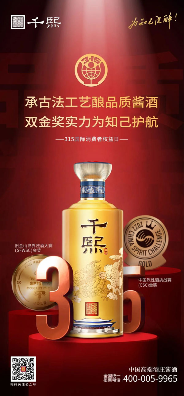 每一年的315消費者權(quán)益日,大眾對食品安全,消費安全總是格外敏感。作為一家以“抱樸守真 一諾千年”為品質(zhì)理念的醬酒企業(yè),從“舊金山世界烈酒大賽金獎”到榮獲“CSC 中國烈性酒挑戰(zhàn)賽金獎”等稱號,千熙酒業(yè)始終不忘初心,以消費者至上為宗旨,以品牌為責(zé)任,為消費者打造品質(zhì)以恒持的一杯好酒。