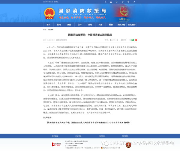 4月24日,國家消防救援局印發(fā)工作方案,部署在全國集中開展消防安全重大風險隱患專項排查整治2023行動,聚焦人員活動集中且易造成群死群傷的單位場所,聚焦近年來重特大火災事故暴露出的問題教訓,全面摸清并動態(tài)掌握現階段消防安全重大風險隱患底數,落實嚴格的安全防范措施,有效降低火災風險,堅決遏制群死群傷重特大火災事故發(fā)生。