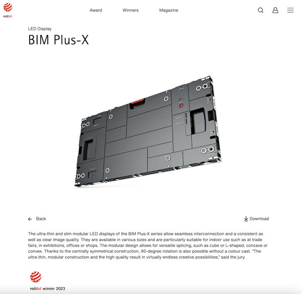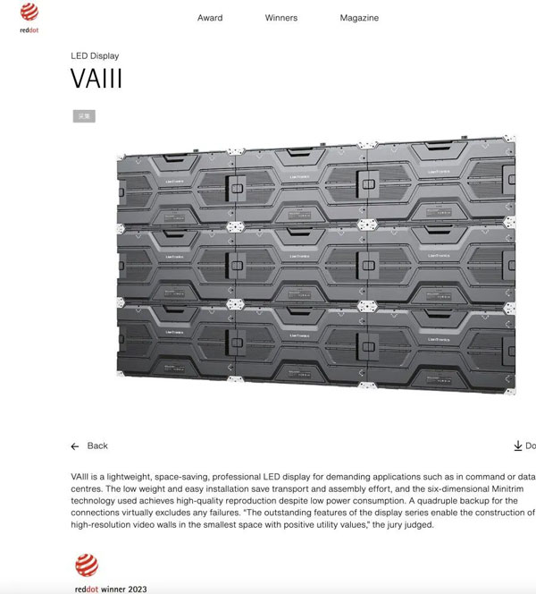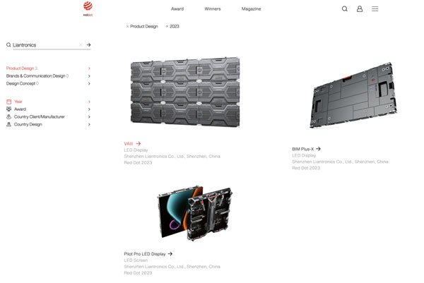 近日,2023年德國紅點設計大獎名單公布。聯(lián)建光電VAIII系列微間距顯示屏、Pilot Pro系列租賃顯示屏、BIM Plus-X系列室內(nèi)商業(yè)顯示屏三款產(chǎn)品同時斬獲素有設計界“奧斯卡”之稱的紅點設計獎,這三款產(chǎn)品凝聚著全球前沿技術和創(chuàng)新設計,實至名歸。據(jù)統(tǒng)計,聯(lián)建光電是2023紅點獎中獲獎最多的LED顯示品牌。