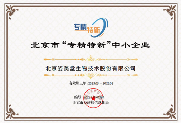 日前,北京市經(jīng)濟和信息化局正式公布2022年第四季度北京市“專精特新”中小企業(yè)名單,北京姿美堂生物技術(shù)股份有限公司憑借在數(shù)字健康領(lǐng)域的創(chuàng)新技術(shù)實力和行業(yè)影響力,獲評認定為北京市“專精特新”中小企業(yè),科技創(chuàng)新勢能持續(xù)釋放。
