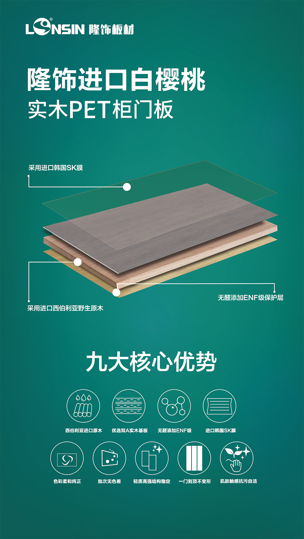“提升高品質(zhì)服務(wù)、推動綠色家居產(chǎn)業(yè)發(fā)展”是隆飾板材一直以來的發(fā)展使命,多年來,隆飾從未停止研發(fā)創(chuàng)新的步伐,不斷與時俱進(jìn),將“工匠精神”融入每一個環(huán)節(jié)中,打造更具競爭力的優(yōu)勢產(chǎn)品和服務(wù)。不僅有一直引以為傲的ENF級生態(tài)板和市場大熱的家具板,隆飾還將重磅推出全新高端產(chǎn)品——“ENF級進(jìn)口白櫻桃高端實(shí)木精板”,滿足了消費(fèi)者對環(huán)保和品質(zhì)愈發(fā)強(qiáng)烈的追求。