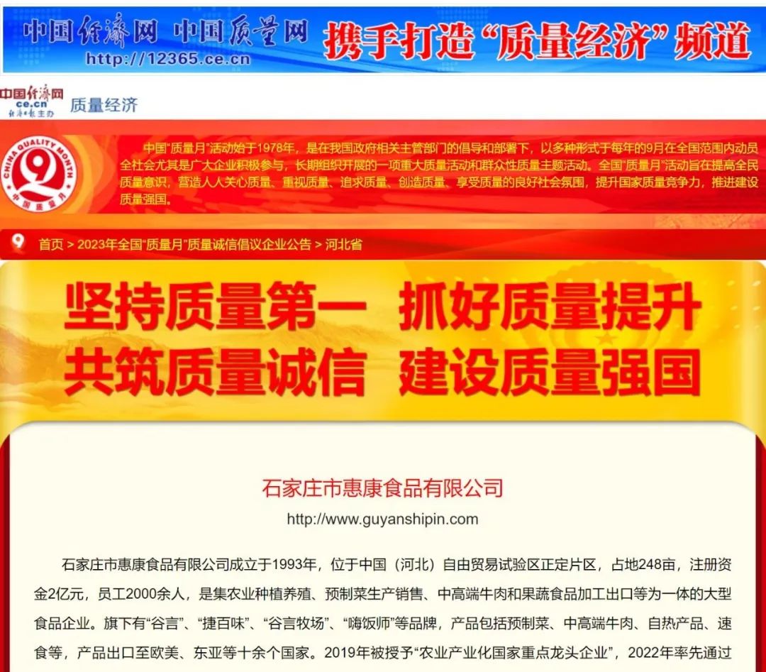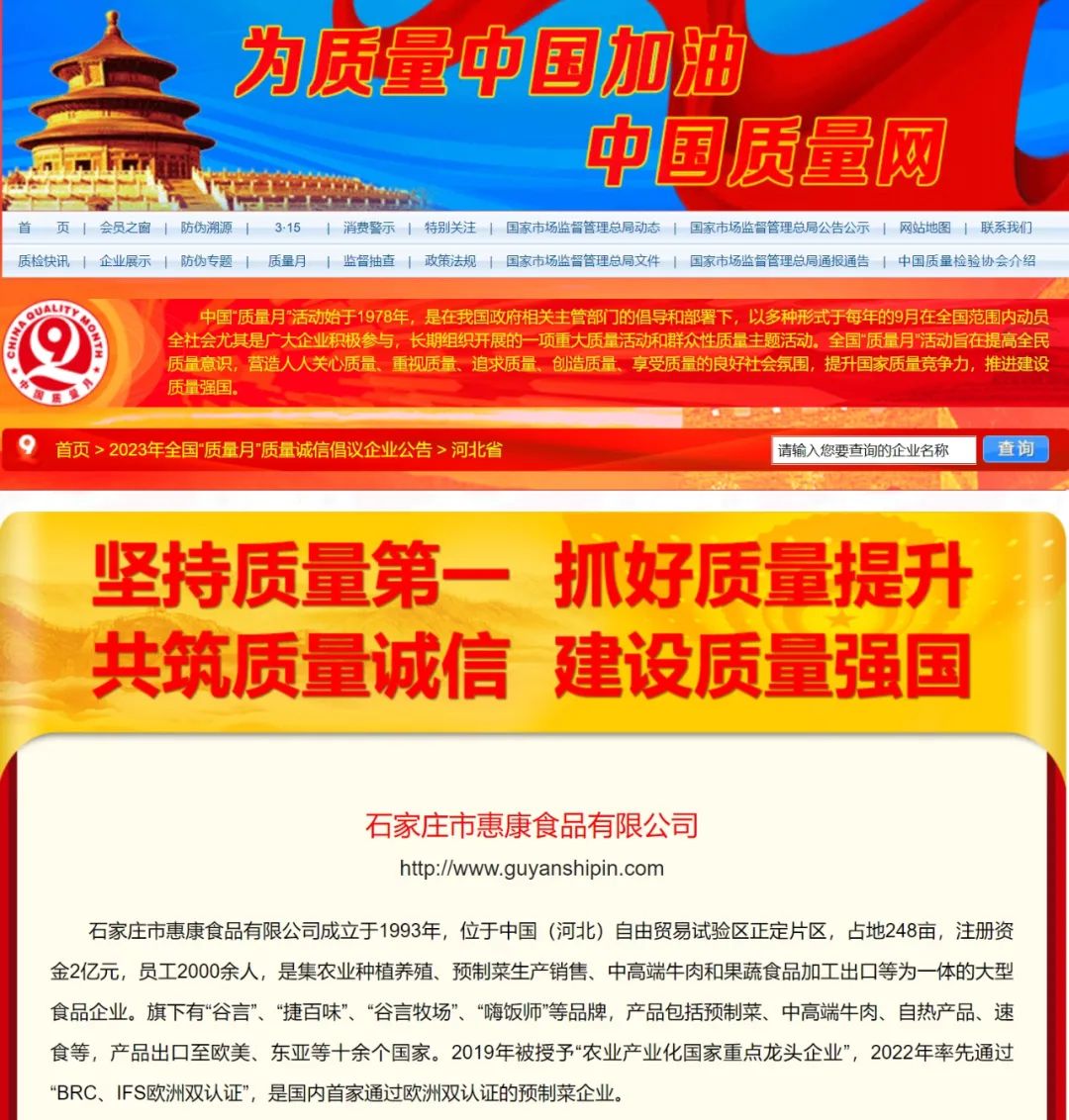 近日,石家莊市惠康食品有限公司再傳捷報(bào),在中國(guó)質(zhì)量檢驗(yàn)協(xié)會(huì)組織開展的2023年全國(guó)“質(zhì)量月”專題活動(dòng)中,深耕食品制造行業(yè)30年的惠康食品,憑借過(guò)硬的產(chǎn)品質(zhì)量再次被授予“全國(guó)質(zhì)量誠(chéng)信標(biāo)桿企業(yè)”?!吨袊?guó)質(zhì)量網(wǎng)》、《中國(guó)經(jīng)濟(jì)網(wǎng)》、《中國(guó)產(chǎn)品質(zhì)量信譽(yù)網(wǎng)》等媒體予以集中展示宣傳。這是中國(guó)質(zhì)量檢驗(yàn)協(xié)會(huì)、社會(huì)各界及消費(fèi)者對(duì)惠康食品產(chǎn)品與服務(wù)質(zhì)量的高度認(rèn)可。