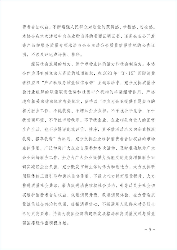 經(jīng)濟社會發(fā)展的動力,源于市場主體的活力和社會創(chuàng)造力。本協(xié)會作為具有獨立法人資質(zhì)的社團組織,在2023年“3·15”國際消費者權(quán)益日“產(chǎn)品和服務(wù)質(zhì)量誠信承諾”主題活動中,充分發(fā)揮質(zhì)量檢驗行業(yè)組織的職能職責(zé)優(yōu)勢和社團中介機構(gòu)的橋梁紐帶作用,嚴(yán)格遵守相關(guān)法律法規(guī)和有關(guān)規(guī)定,堅持以“切實為企業(yè)提供自愿參與的相關(guān)服務(wù)工作,不亂收費、不增加企業(yè)負(fù)擔(dān),不干擾公平競爭,不干擾營商環(huán)境,不干擾市場秩序,不干擾企業(yè)、企業(yè)相關(guān)負(fù)責(zé)人的正常生產(chǎn)生活,也不涉嫌評比或評價、排序,更不借活動名義向企業(yè)攤派收費、搭車收費”為原則,充分發(fā)揮企業(yè)維護消費者合法權(quán)益的市場主體作用,廣泛動員廣大企業(yè)自愿參加本次活動,及時準(zhǔn)確地為廣大企業(yè)做好服務(wù)工作,全力為廣大企業(yè)提供力所能及的免費增值服務(wù)而切實減輕企業(yè)負(fù)擔(dān),充分激發(fā)市場主體的活力和創(chuàng)造力,大力發(fā)揮新聞媒體的正面引導(dǎo)和輿論監(jiān)督作用,下最大氣力抓好質(zhì)量提升,大力推進(jìn)質(zhì)量社會共治,著力促進(jìn)消費維權(quán)社會共治,引導(dǎo)動員全社會切實維護消費者合法權(quán)益,促進(jìn)消費升級,改善消費體驗,全力營造質(zhì)量誠信社會共治的氛圍,提振消費信心,不斷滿足人民群眾對美好生活的更高要求,持續(xù)為我國經(jīng)濟構(gòu)建新發(fā)展格局和高質(zhì)量發(fā)展與質(zhì)量強國建設(shè)作出積極貢獻(xiàn)。