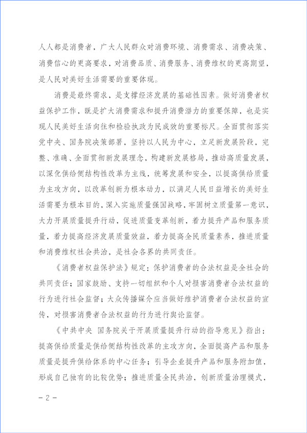 消費是最終需求,是支撐經(jīng)濟發(fā)展的基礎(chǔ)性因素。做好消費者權(quán)益保護工作,既是擴大消費需求和提升消費潛力的重要保障,也是實現(xiàn)人民美好生活向往和檢驗執(zhí)政為民成效的重要標(biāo)尺。全面貫徹落實黨中央、國務(wù)院決策部署,堅持以人民為中心,立足新發(fā)展階段,完整、準(zhǔn)確、全面貫徹新發(fā)展理念,構(gòu)建新發(fā)展格局,推動高質(zhì)量發(fā)展,以深化供給側(cè)結(jié)構(gòu)性改革為主線,統(tǒng)籌發(fā)展和安全,以提高供給質(zhì)量為主攻方向,以改革創(chuàng)新為根本動力,以滿足人民日益增長的美好生活需要為根本目的,深入實施質(zhì)量強國戰(zhàn)略,牢固樹立質(zhì)量第一意識,大力開展質(zhì)量提升行動,促進(jìn)質(zhì)量變革創(chuàng)新,著力提升產(chǎn)品和服務(wù)質(zhì)量,著力提高經(jīng)濟發(fā)展質(zhì)量效益,著力提高全民質(zhì)量素養(yǎng),推進(jìn)質(zhì)量和消費維權(quán)社會共治,是社會各界的共同責(zé)任。
