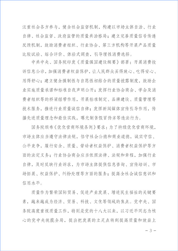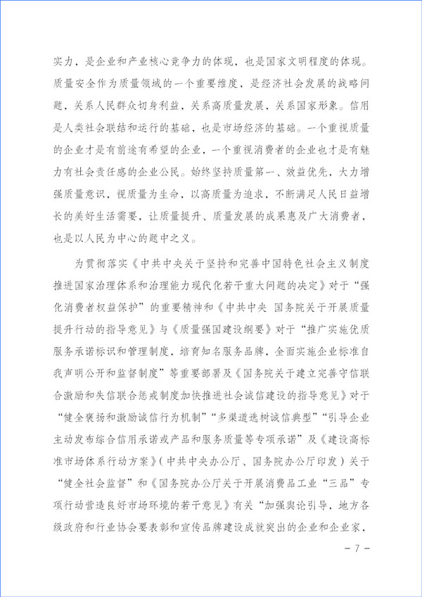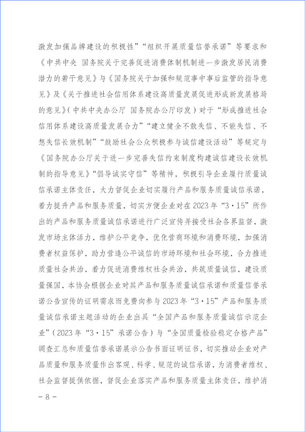為貫徹落實《中共中央關(guān)于堅持和完善中國特色社會主義制度 推進(jìn)國家治理體系和治理能力現(xiàn)代化若干重大問題的決定》對于“強化消費者權(quán)益保護”的重要精神和《中共中央 國務(wù)院關(guān)于開展質(zhì)量提升行動的指導(dǎo)意見》與《質(zhì)量強國建設(shè)綱要》對于“推廣實施優(yōu)質(zhì)服務(wù)承諾標(biāo)識和管理制度,培育知名服務(wù)品牌,全面實施企業(yè)標(biāo)準(zhǔn)自我聲明公開和監(jiān)督制度”等重要部署及《國務(wù)院關(guān)于建立完善守信聯(lián)合激勵和失信聯(lián)合懲戒制度加快推進(jìn)社會誠信建設(shè)的指導(dǎo)意見》對于“健全褒揚和激勵誠信行為機制”“多渠道選樹誠信典型”“引導(dǎo)企業(yè)主動發(fā)布綜合信用承諾或產(chǎn)品和服務(wù)質(zhì)量等專項承諾”及《建設(shè)高標(biāo)準(zhǔn)市場體系行動方案》(中共中央辦公廳、國務(wù)院辦公廳印發(fā))關(guān)于“健全社會監(jiān)督”和《國務(wù)院辦公廳關(guān)于開展消費品工業(yè)“三品”專項行動營造良好市場環(huán)境的若干意見》有關(guān)“加強輿論引導(dǎo),地方各級政府和行業(yè)協(xié)會要表彰和宣傳品牌建設(shè)成就突出的企業(yè)和企業(yè)家,激發(fā)加強品牌建設(shè)的積極性”“組織開展質(zhì)量信譽承諾”等要求和《中共中央 國務(wù)院關(guān)于完善促進(jìn)消費體制機制進(jìn)一步激發(fā)居民消費潛力的若干意見》與《國務(wù)院關(guān)于加強和規(guī)范事中事后監(jiān)管的指導(dǎo)意見》及《關(guān)于推進(jìn)社會信用體系建設(shè)高質(zhì)量發(fā)展促進(jìn)形成新發(fā)展格局的意見》(中共中央辦公廳 國務(wù)院辦公廳印發(fā))對于“形成推進(jìn)社會信用體系建設(shè)高質(zhì)量發(fā)展合力”“建立健全不敢失信、不能失信、不想失信長效機制”“鼓勵社會公眾積極參與誠信建設(shè)活動”等規(guī)定與《國務(wù)院辦公廳關(guān)于進(jìn)一步完善失信約束制度構(gòu)建誠信建設(shè)長效機制的指導(dǎo)意見》“倡導(dǎo)誠實守信”等精神,積極引導(dǎo)企業(yè)履行質(zhì)量誠信承諾主體責(zé)任,大力督促企業(yè)切實履行產(chǎn)品和服務(wù)質(zhì)量誠信承諾,著力提升產(chǎn)品和服務(wù)質(zhì)量,切實方便企業(yè)對在2023年“3·15”所作出的產(chǎn)品和服務(wù)質(zhì)量誠信承諾進(jìn)行廣泛宣傳并接受社會各界監(jiān)督,激發(fā)市場主體活力,維護公平競爭,優(yōu)化營商環(huán)境和消費環(huán)境,加強消費者權(quán)益保護,助力營造公平誠信的市場環(huán)境和社會環(huán)境,合力推進(jìn)質(zhì)量社會共治,著力促進(jìn)消費維權(quán)社會共治,共筑質(zhì)量誠信,建設(shè)質(zhì)量強國,本協(xié)會根據(jù)企業(yè)對其產(chǎn)品和服務(wù)質(zhì)量誠信承諾和質(zhì)量信譽承諾公告宣傳的證明需求而免費向參與2023年“3·15”產(chǎn)品和服務(wù)質(zhì)量誠信承諾主題活動的企業(yè)出具“全國產(chǎn)品和服務(wù)質(zhì)量誠信示范企業(yè)”(2023年“3·15”承諾公告)與“全國質(zhì)量檢驗穩(wěn)定合格產(chǎn)品”調(diào)查匯總和質(zhì)量信譽承諾展示公告書面證明證書,切實推動企業(yè)對產(chǎn)品質(zhì)量和服務(wù)質(zhì)量作出客觀、科學(xué)、規(guī)范的誠信承諾,為消費者維權(quán)、社會監(jiān)督提供依據(jù),督促企業(yè)落實產(chǎn)品和服務(wù)質(zhì)量主體責(zé)任,維護消費者合法權(quán)益,不斷增強人民群眾對質(zhì)量的獲得感、幸福感、安全感。本協(xié)會在本次活動中向企業(yè)所出具的書面證明證書,謹(jǐn)系企業(yè)公開發(fā)布產(chǎn)品和服務(wù)質(zhì)量專項承諾與企業(yè)主動公告質(zhì)量信譽情況的公告證明,不涉及評比或評價、排序。
