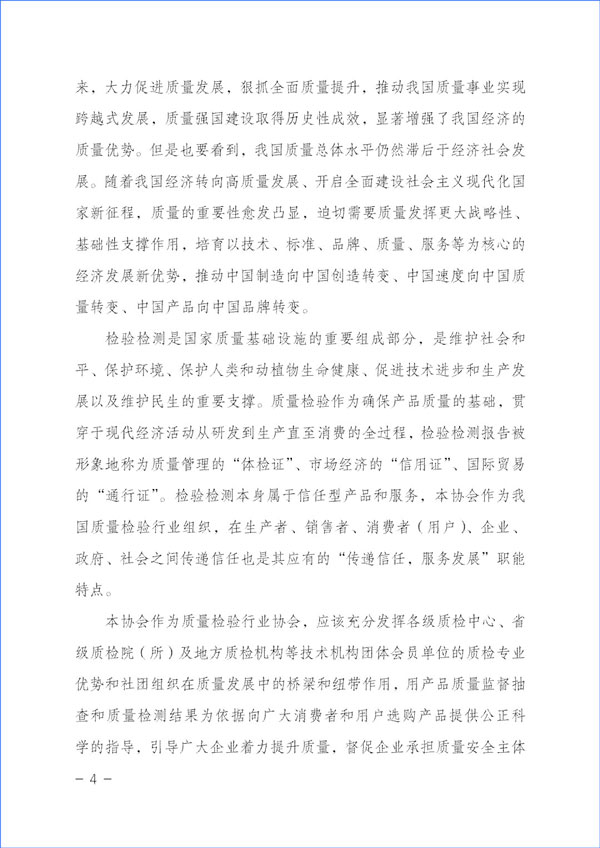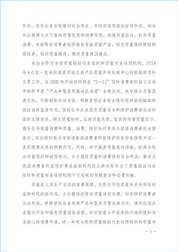 本協(xié)會作為質(zhì)量檢驗行業(yè)協(xié)會,應(yīng)該充分發(fā)揮各級質(zhì)檢中心、省級質(zhì)檢院(所)及地方質(zhì)檢機構(gòu)等技術(shù)機構(gòu)團體會員單位的質(zhì)檢專業(yè)優(yōu)勢和社團組織在質(zhì)量發(fā)展中的橋梁和紐帶作用,用產(chǎn)品質(zhì)量監(jiān)督抽查和質(zhì)量檢測結(jié)果為依據(jù)向廣大消費者和用戶選購產(chǎn)品提供公正科學(xué)的指導(dǎo),引導(dǎo)廣大企業(yè)著力提升質(zhì)量,督促企業(yè)承擔(dān)質(zhì)量安全主體作用,倡導(dǎo)企業(yè)自覺履行社會責(zé)任,并切實運用輿論宣傳作用,向全社會提供公正可靠的質(zhì)量信息和消費信息,傳遞質(zhì)量信任,引導(dǎo)質(zhì)量消費,有效幫助消費者選擇高標(biāo)準(zhǔn)高質(zhì)量產(chǎn)品,助力質(zhì)量供給側(cè)結(jié)構(gòu)性改革,抓好質(zhì)量提升,推進(jìn)質(zhì)量強國建設(shè)。