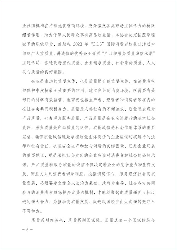 質(zhì)量是人類生產(chǎn)生活的重要保障。為努力開創(chuàng)質(zhì)量專業(yè)社團組織在新時代的新作用,大力推動經(jīng)營者質(zhì)量誠信自律,切實維護消費者合法權(quán)益,積極督促企業(yè)承諾產(chǎn)品和服務(wù)質(zhì)量主體責(zé)任,強化引領(lǐng)企業(yè)履行產(chǎn)品和服務(wù)質(zhì)量誠信承諾,切實營造公平競爭的市場環(huán)境和安全放心的消費環(huán)境,進(jìn)一步充分發(fā)揮質(zhì)量檢驗行業(yè)社團組織和質(zhì)量專業(yè)社團機構(gòu)在持續(xù)優(yōu)化營商環(huán)境、充分激發(fā)各類市場主體活力的橋梁紐帶作用,助力保障人民群眾享有高品質(zhì)生活,本協(xié)會決定按照章程賦予的職能職責(zé),繼續(xù)在2023年“3·15”國際消費者權(quán)益日活動中組織廣大重質(zhì)量、講誠信的優(yōu)秀企業(yè)開展“產(chǎn)品和服務(wù)質(zhì)量誠信承諾”主題活動,營造政府重視質(zhì)量、企業(yè)追求質(zhì)量、社會崇尚質(zhì)量、人人關(guān)心質(zhì)量的良好氛圍。