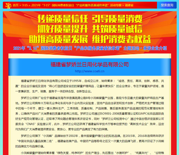 引導(dǎo)質(zhì)量消費(fèi),共筑質(zhì)量誠(chéng)信,3月15日,由中國(guó)質(zhì)量檢驗(yàn)協(xié)會(huì)主辦的2021年“3.15”產(chǎn)品和服務(wù)質(zhì)量誠(chéng)信承諾的主題活動(dòng)如期舉行,小浣熊作為“3.15”產(chǎn)品和服務(wù)質(zhì)量誠(chéng)信承諾企業(yè),憑借匠心的品質(zhì)、優(yōu)質(zhì)的服務(wù)及良好的口碑,獲得協(xié)會(huì)以及權(quán)威專家的一致認(rèn)可,榮獲“全國(guó)產(chǎn)品和服務(wù)質(zhì)量誠(chéng)信示范企業(yè)”,“全國(guó)質(zhì)量誠(chéng)信先進(jìn)企業(yè)”、“全國(guó)質(zhì)量信譽(yù)保障產(chǎn)品”、“全國(guó)日化行業(yè)質(zhì)量領(lǐng)先品牌” 等多項(xiàng)榮譽(yù),《中國(guó)質(zhì)量報(bào)》、《中國(guó)消費(fèi)者報(bào)》及中國(guó)質(zhì)量網(wǎng)、中國(guó)經(jīng)濟(jì)網(wǎng)、中國(guó)消費(fèi)網(wǎng)等多家媒體均予以集中展示和公告。