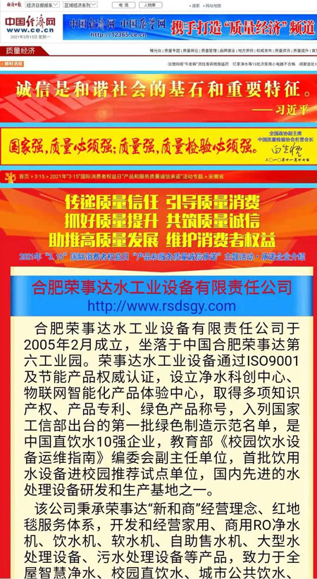 作為凈水行業(yè)領(lǐng)軍企業(yè),榮事達(dá)積極響應(yīng)中國(guó)質(zhì)量檢驗(yàn)協(xié)會(huì)“產(chǎn)品和服務(wù)質(zhì)量誠(chéng)信承諾”號(hào)召,面向廣大用戶做出相關(guān)產(chǎn)品和服務(wù)質(zhì)量誠(chéng)信承諾,體現(xiàn)了企業(yè)應(yīng)有的社會(huì)責(zé)任和擔(dān)當(dāng)。榮事達(dá)從中脫穎而出,一舉獲得“全國(guó)產(chǎn)品和服務(wù)質(zhì)量誠(chéng)信示范企業(yè)”“全國(guó)質(zhì)量信得過(guò)產(chǎn)品”“全國(guó)凈水行業(yè)質(zhì)量領(lǐng)先品牌”“全國(guó)質(zhì)量誠(chéng)信先進(jìn)企業(yè)”四項(xiàng)殊榮,相關(guān)承諾和獲獎(jiǎng)情況已在中國(guó)質(zhì)量網(wǎng)、中國(guó)經(jīng)濟(jì)網(wǎng)、中國(guó)消費(fèi)網(wǎng)在線發(fā)布。該項(xiàng)活動(dòng)也得到人民網(wǎng)、新華網(wǎng)、央視網(wǎng)、搜狐網(wǎng)等主流網(wǎng)絡(luò)媒體的報(bào)道。