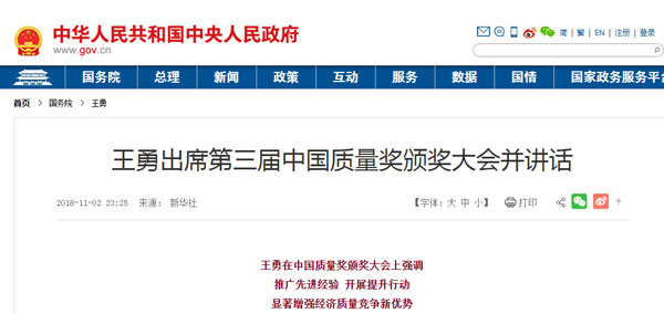 11月2日,第三屆中國質(zhì)量獎頒獎大會在京召開。