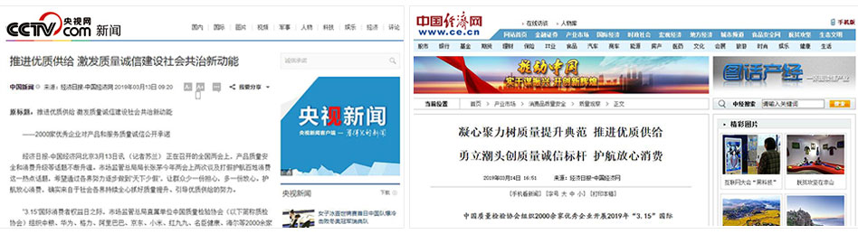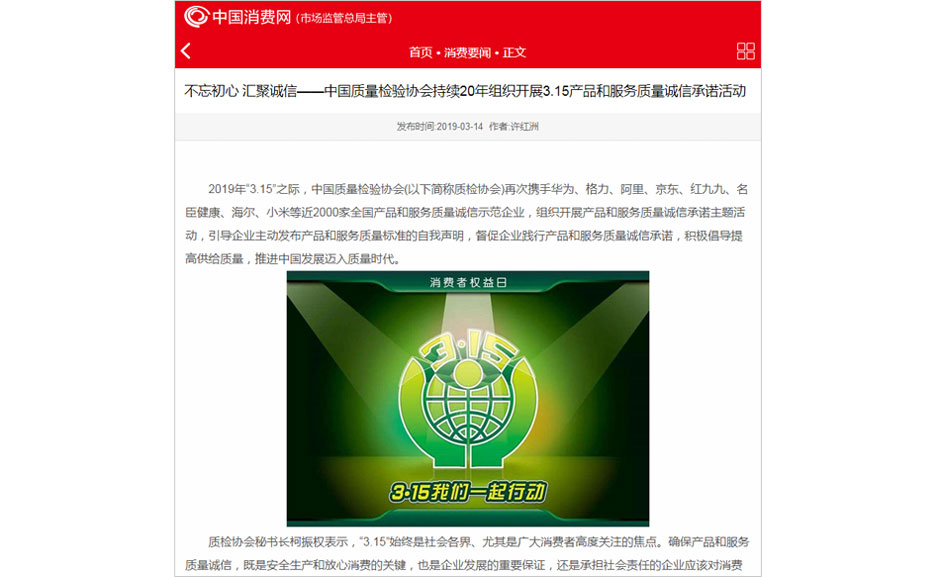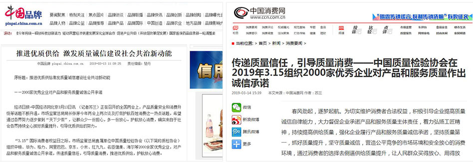 •中國消費網(wǎng)《傳遞質(zhì)量信任,引導質(zhì)量消費——中國質(zhì)量檢驗協(xié)會在2019年3.15組織2000家優(yōu)秀企業(yè)對產(chǎn)品和服務質(zhì)量作出誠信承諾》